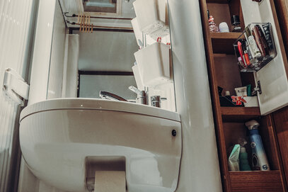 Modulare Körbchen im Spiegelschrank, schmale Ablagen neben Waschbecken und Haken für Handtücher sorgen dafür, dass Zahnbürsten, Kosmetik und Handtücher sicher verstaut und schnell griffbereit sind – selbst wenn’s mal eng wird.