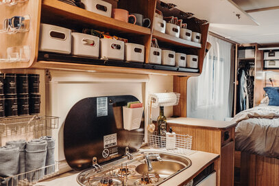 Modulare Boxen in den Oberschränken, Drahtkörbchen neben Spüle und Spülbürste sowie ein praktischer Gewürzständer an der Wand sorgen dafür, dass Tassen, Gewürze und Reinigungsutensilien jederzeit sicher verstaut und schnell zur Hand sind – selbst auf holpriger Fahrt.