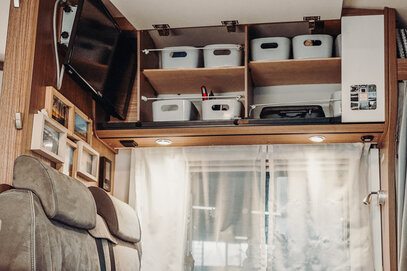 Durchdachte Oberschrank-Boxen, fixiert mit Spanngurten, halten Kissen, Decken und Bücher sicher an ihrem Platz. So bleibt die Sitzgruppe auch auf kurvigen Strecken aufgeräumt und jederzeit gemütlich.