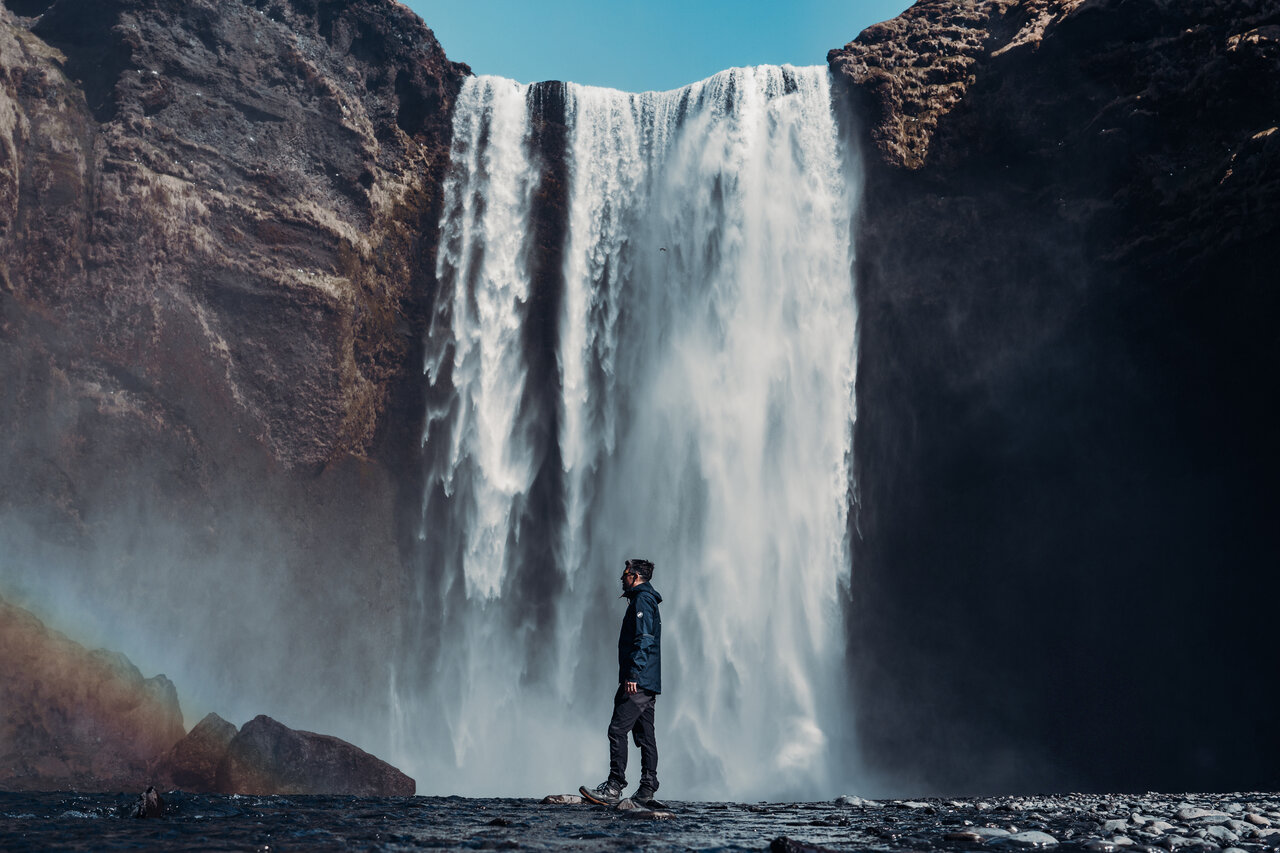 157 Kilometer später kommen wir bei unserem ersten Foto-Highlight an: dem Skógafoss Wasserfall. Mit einer Breite von 25 Metern und einem Gefälle von 60 Metern gehört der Wasserfall zu den größten des Landes. Durch die Gischt, die der er produziert, entstehen sobald die Sonne hervor tritt mindestens ein Regenbogen. Und siehe da: auch an diesem Tag! Eine Legende besagt übrigens, dass der Siedler Þrasi seinen Goldschatz hinter dem Fall versenkt haben soll. Wir schauen beim nächsten Mal nach. Heute sind wir vor allem froh darüber, so nah mit dem Camper an die Naturgewalt heranfahren zu können. Der ideale Spot zum kurzen Verweilen und Genießen!