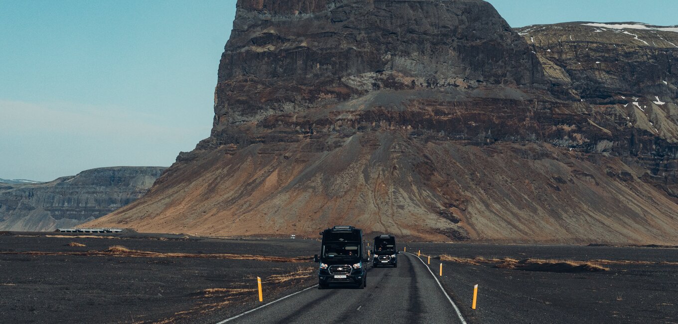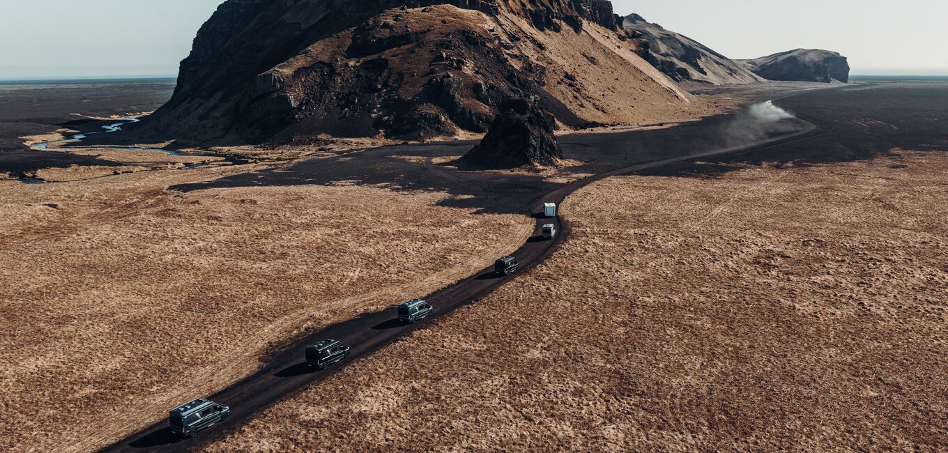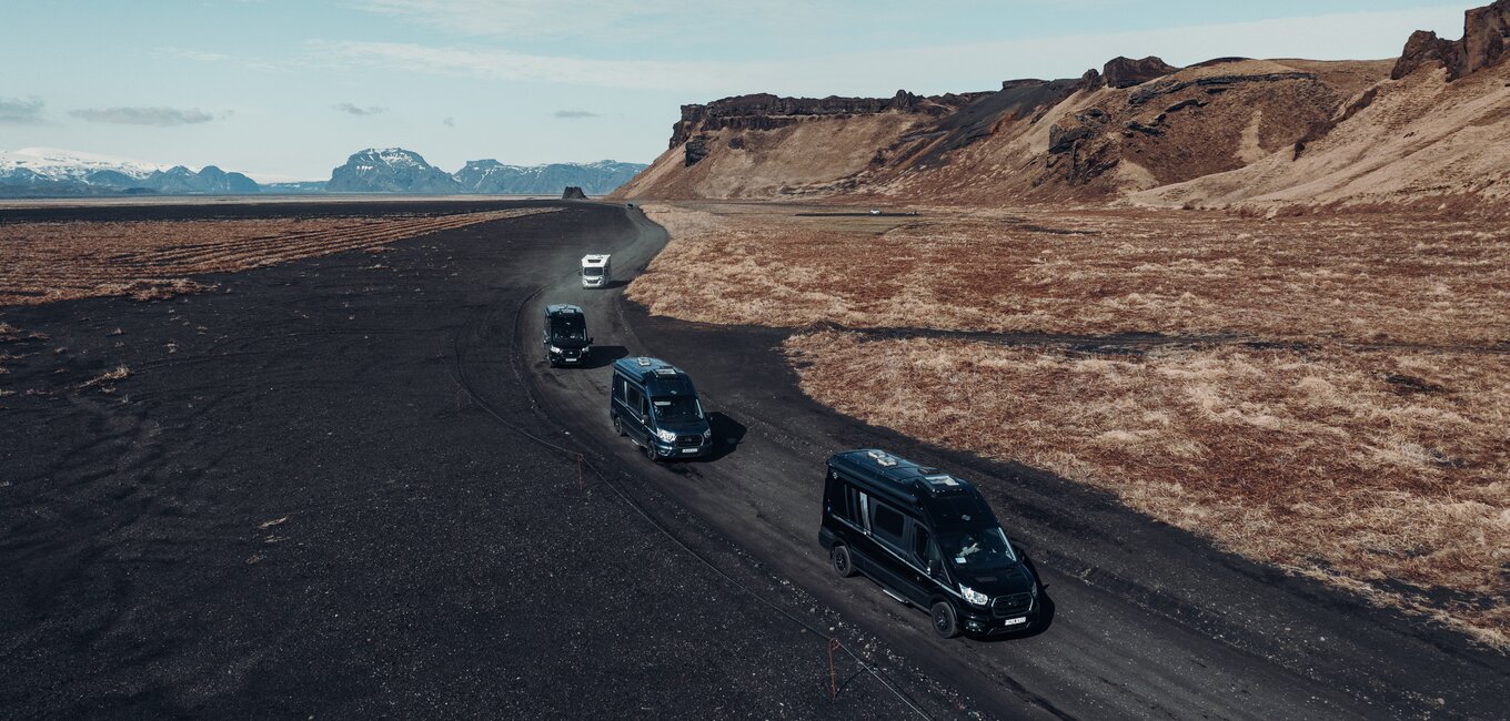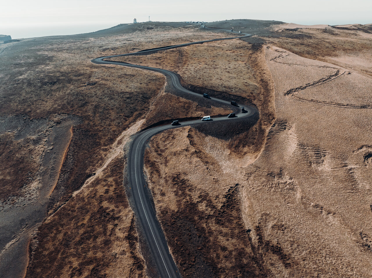 Unser nächstes Ziel liegt gut 60 Minuten entfernt: die 115 Meter hohe Halbinsel Dyrhólaey. Sie erhebt sich stolz aus dem Meer und scheint auf den ersten Blick herausfordernd für Fahrer*innen durch die steilen, gewundenen Straßen bei der Auffahrt.. Mit dem CV590 4x4 jedoch überhaupt kein Problem – und oben angekommen lohnt sich der Ausblick für unsere Fotos besonders. Eines der Highlights ist ein natürlicher Felsbogen, der sich majestätisch ins Meer erstreckt. Rechts und links führen schwarze Sandstrände die Küste entlang. Das wollen wir uns morgen genauer ansehen!