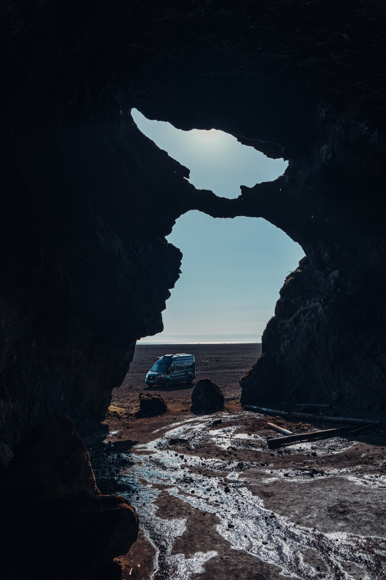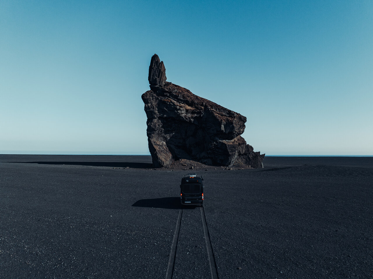 Zuvor haben wir abgeklärt, dass wir mit dem Carado nicht nur bis vor die Höhle, sondern auch weiter auf dem schwarzen Strand fahren dürfen – ein privater Teil des „Viking Parks“. Ohne Erlaubnis ist das nicht möglich. Wir werden das Fahrerlebnis auf jeden Fall nicht so schnell vergessen. Diese Umgebung stellt hohe Anforderungen an die Fahrzeuge. Wie erhofft war aber vor allem der Allradantrieb des Carado nützlich. Problemlos ließ sich das Fahrzeug über die unterschiedlichen Sanddichten fahren, ohne an Geschwindigkeit oder Stabilität zu verlieren. So fühlt sich Unabhängigkeit an!