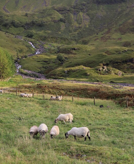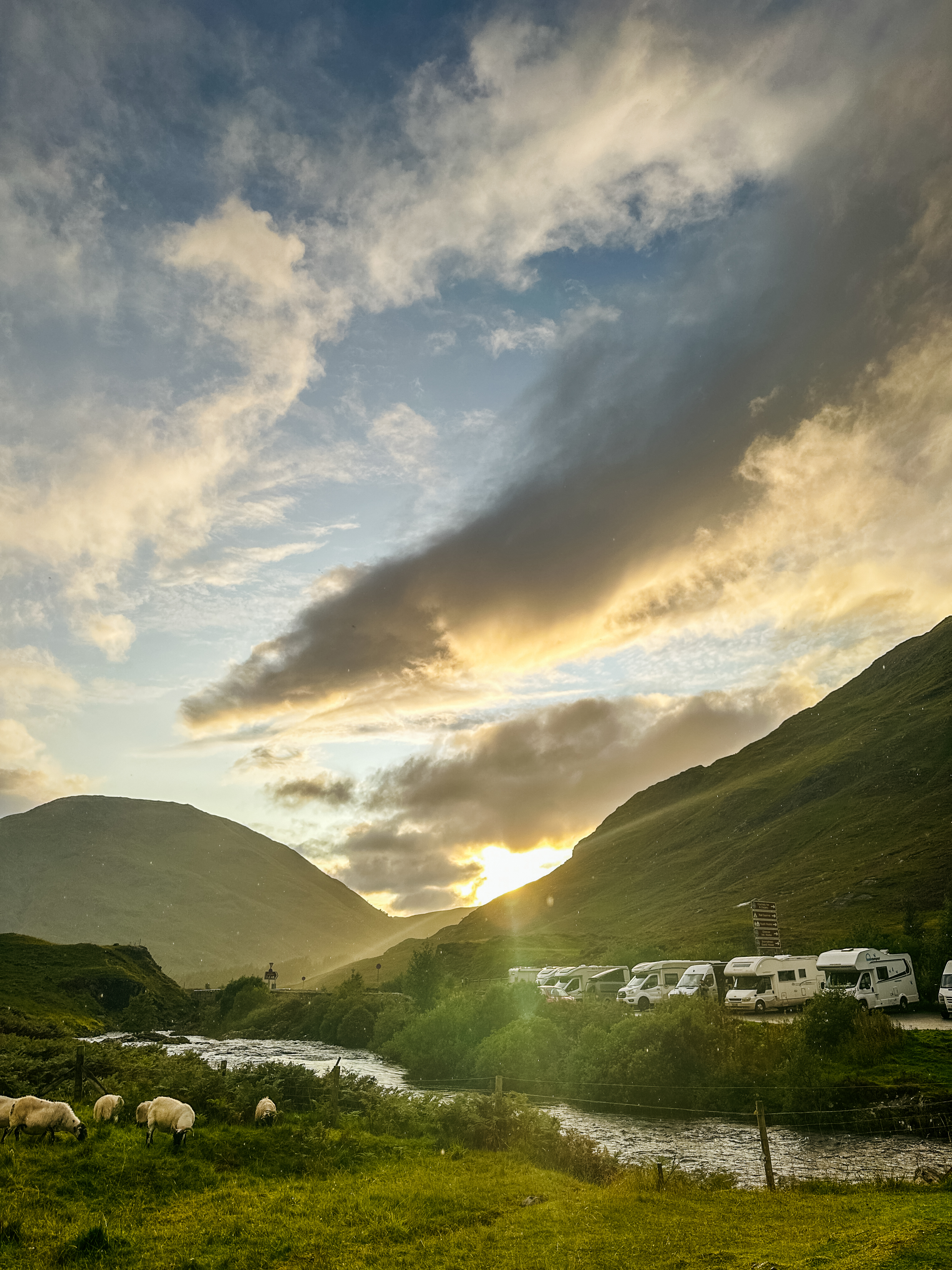 Im Glen Coe fanden wir einen Parkplatz (Loch Achtriochtan Car Park) zum Übernachten, wo es uns die Sprache verschlagen hat. Rundherum Berge, Wasserfälle, ein See, ein Bach und unzählige Schafe. Traumhaft schön!