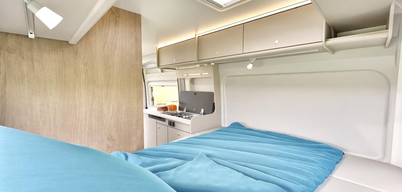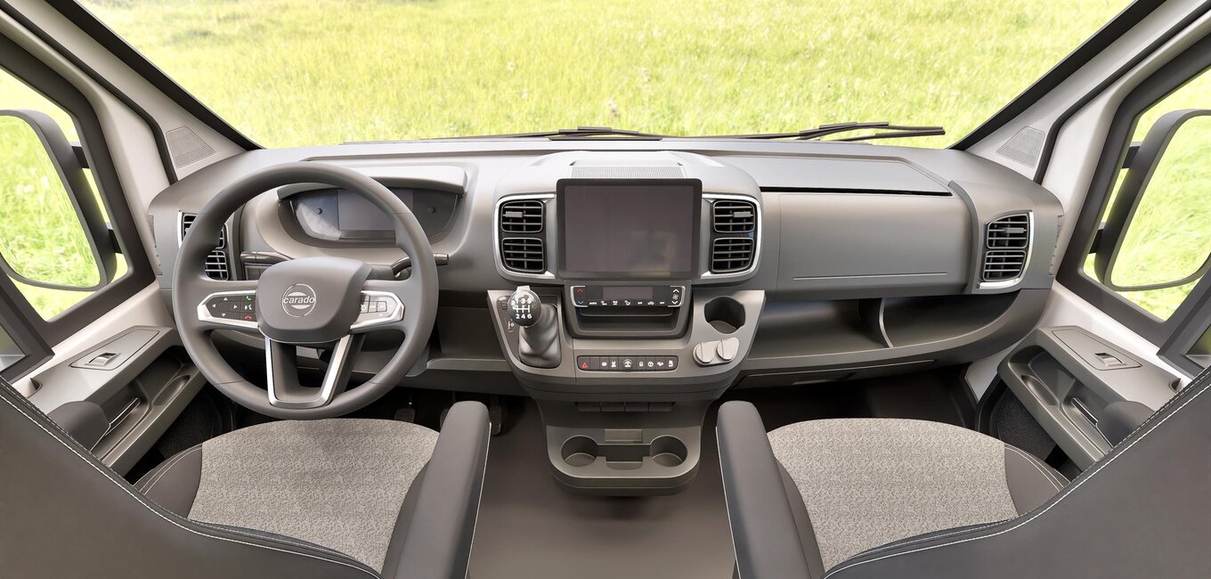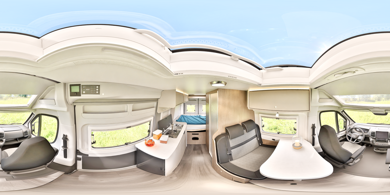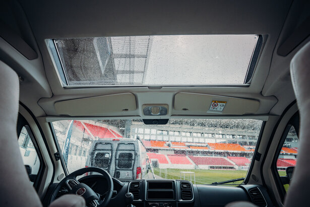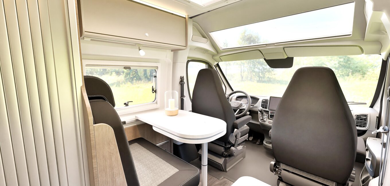 Das großzügige Panoramafenster über dem Fahrer- und Beifahrersitz lässt viel Tageslicht herein und sorgt für eine helle, freundliche Atmosphäre im Wohnbereich. Genießen Sie eine klare Aussicht und ein offenes Raumgefühl – perfekt für entspannte Fahrten und erholsame Pausen.