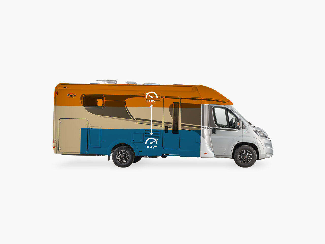 Bon à savoir : selon le règlement relatif à l'admission des véhicules à la circulation routière, le « poids à vide » correspond à la masse du véhicule en ordre de marche. Cela comprend le poids du véhicule, celui du réservoir d'essence rempli à 90 %, des réservoirs de gaz et d'eau potable remplis à 100 % et d'un conducteur d'environ 75 kg. La « capacité de charge » correspond à la charge utile du camping-car. La norme EN 1646-2 prévoit une charge minimale de 75 kg et 10 kg de bagages par siège et par passager et autorise 10 kg de bagages supplémentaires par mètre de véhicule. Veillez cependant à bien répartir vos bagages. Plus le coffre ou l'arrière est chargé, plus l'effet de levier va peser sur les essieux. La masse en ordre de marche ainsi que la charge utile possible et le nombre de passagers peuvent changer en fonction de la motorisation, du type d'équipement, ou si le véhicule dispose d'équipements en option. Des écarts dans les tolérances d'usine sont possibles et autorisés.