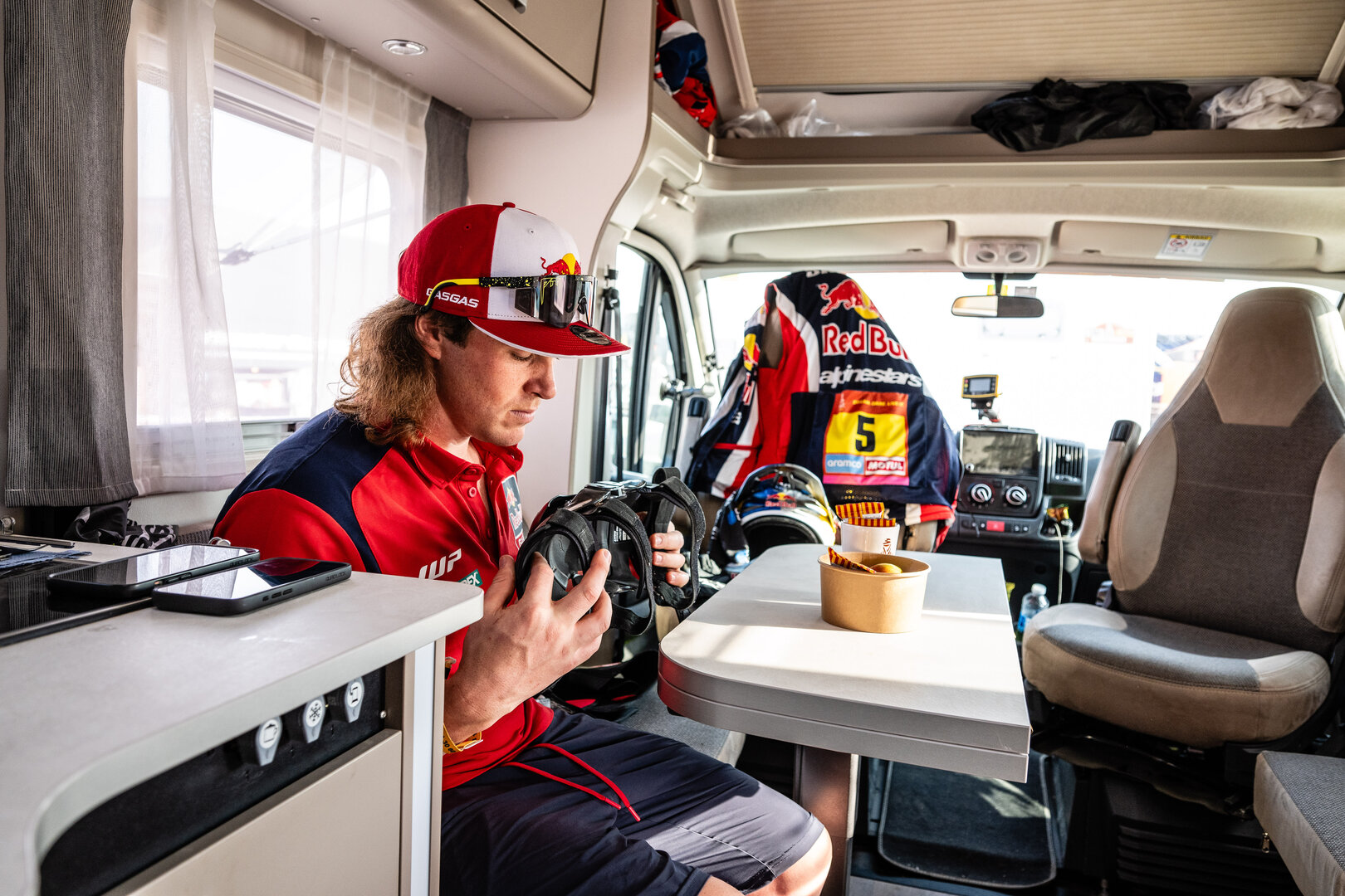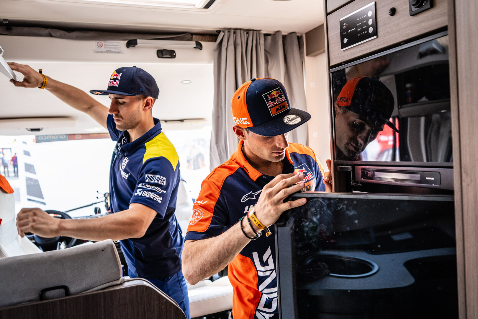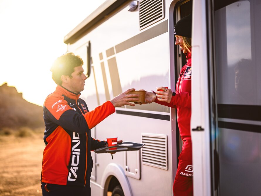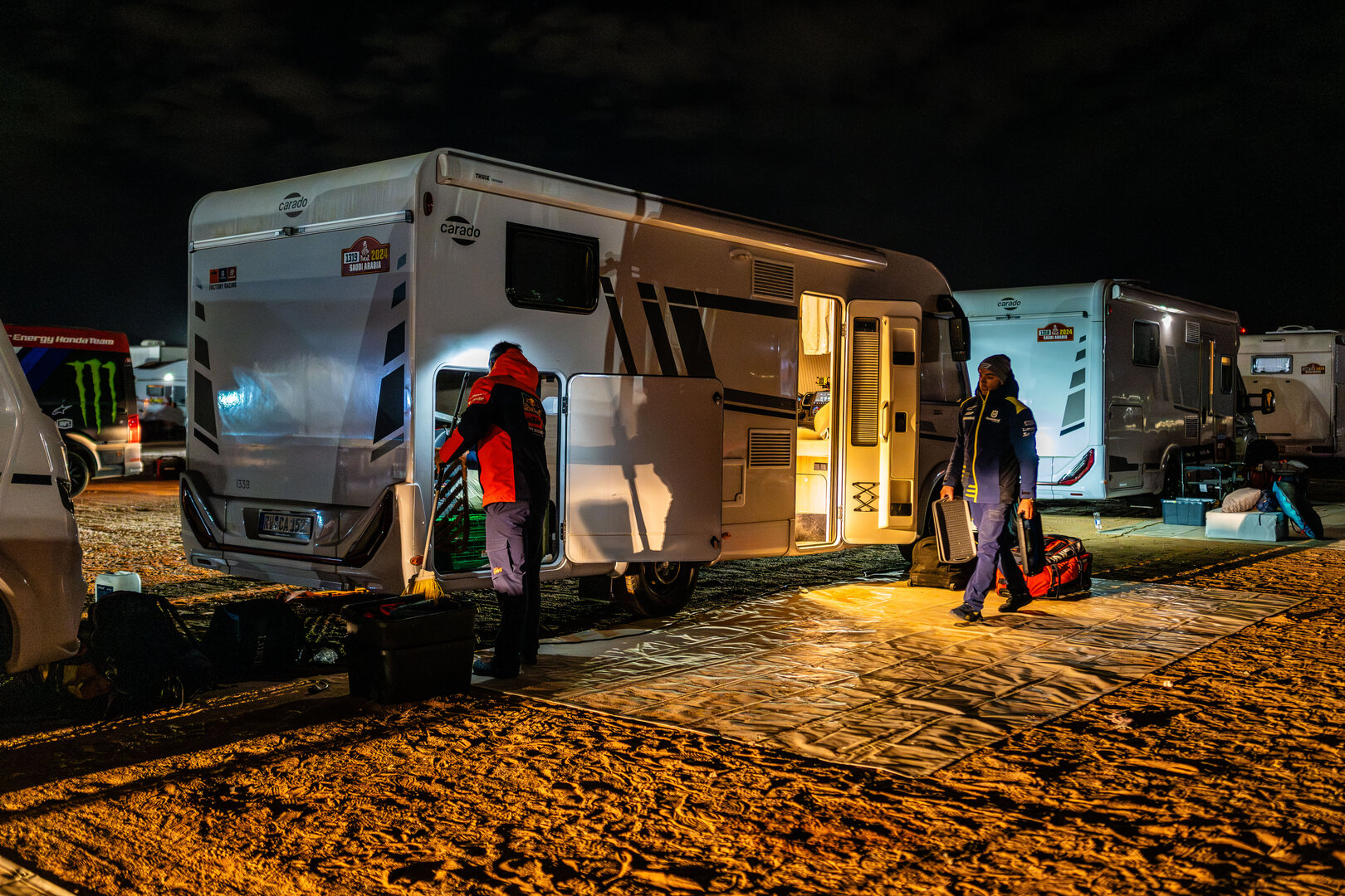 Il est effectivement important que toute l'attention des coureurs soit portée sur la course. Cela signifie qu'il est donc primordial d'organiser au mieux leur vie dans le désert lorsqu'ils ne sont pas au volant. Pour cela, l'idéal est d'avoir un camping-car confortable, avec un couchage optimal pour reprendre des forces. Cette année Carado nous en a donné la possibilité et nos pilotes étaient ravis.
