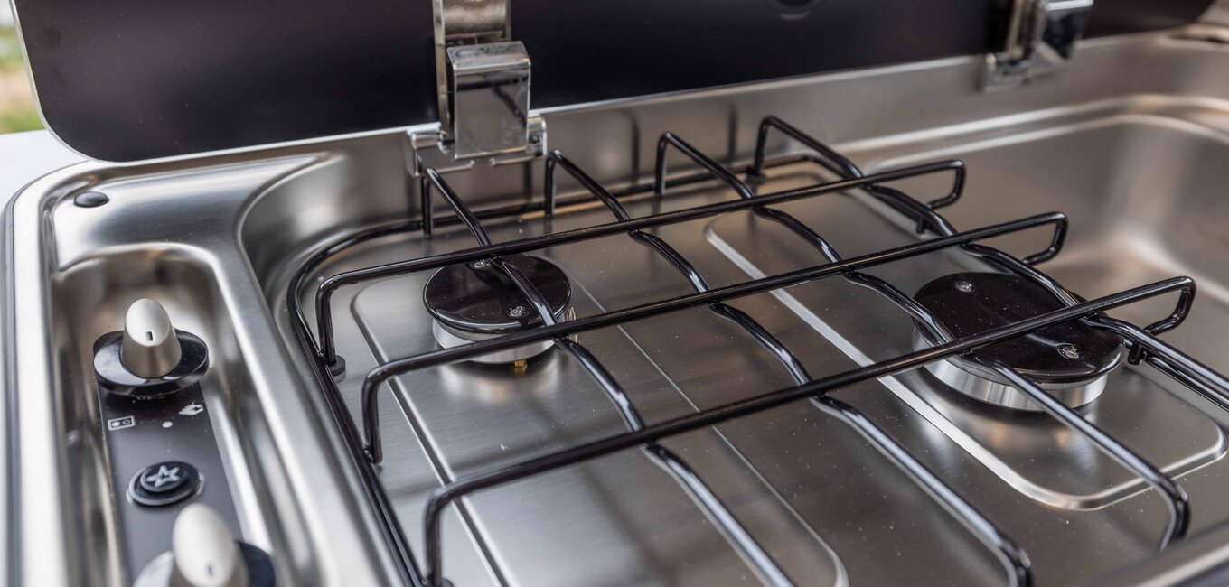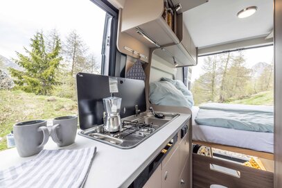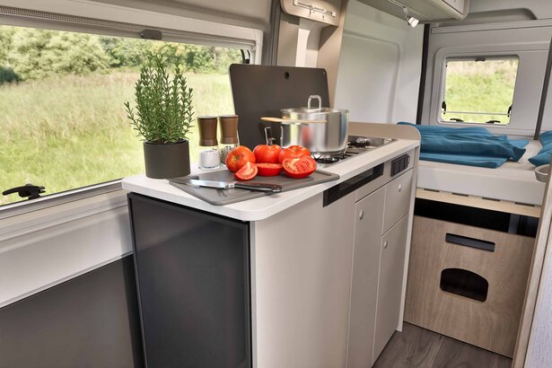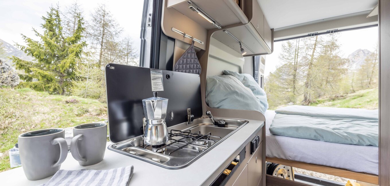 La cuisine est très spacieuse pour la taille du véhicule. Elle offre beaucoup d'espace pour cuisiner et est équipée d'une plaque de cuisson à deux feux, ce qui rend la préparation des repas sur la route très agréable.