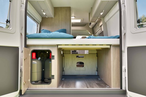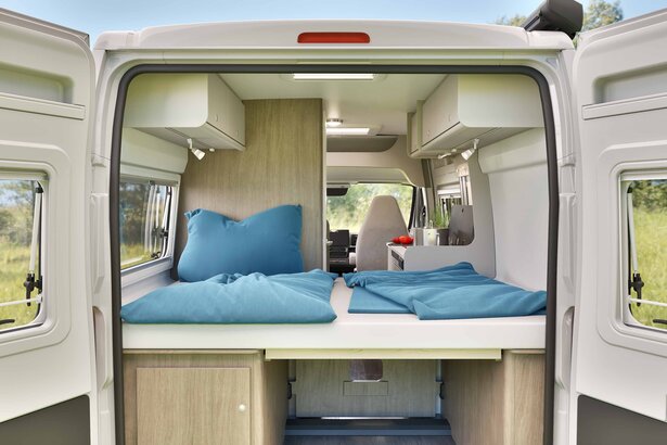 Oasis de sommeil avec vue panoramique. Avec le lit longitudinal à l'arrière, il suffit pour cela d'ouvrir les portes.