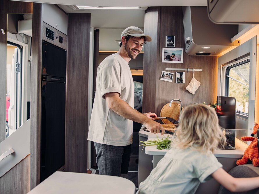Nos cuisines aménagées de manière ergonomique sont parfaitement intégrées dans l'espace de vie. La garantie d'une entière flexibilité même dans un espace restreint se fait à travers une surface de travail spacieuse, une plaque de cuisson de haute qualité accompagnée d'un couvercle en verre. Les équipements de série : généreux tiroirs de rangement avec système Servo-Soft dans le bloc cuisine, éclairage LED, réfrigérateur spacieux avec un freezer en option. C'est ainsi que la passion naît dans la cuisine.