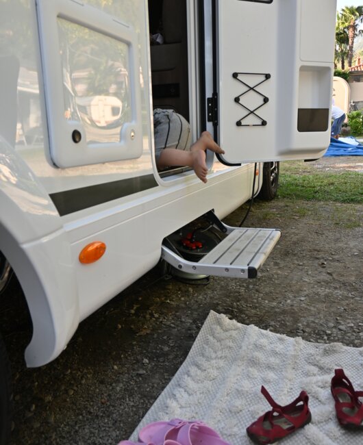 Eine große Plane - um nicht auf den nackten Boden zu treten, wenn man sich vor dem Wohnmobil aufhält. Eine Duschtaschen für jede Partei - am besten eignen sich Ikeatüten. Genug Wechselwäsche für ALLE! IMMER für jedes Wetter Kleidung packen.