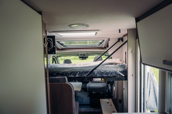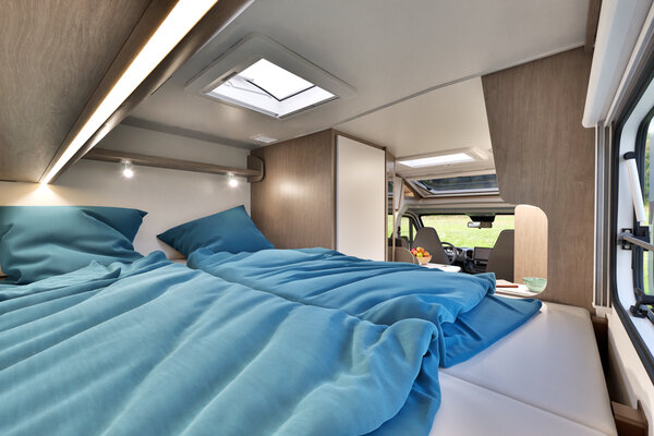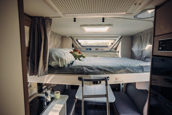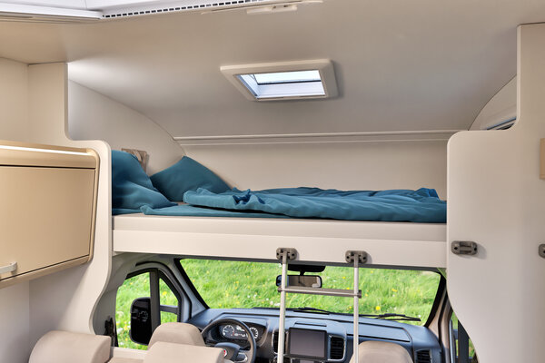 Im Alkoven entsteht durch das offene und großzügige Bett ein sehr gemütlicher Schlafplatz. Tagsüber ist dieser durch die praktischen Fenster lichtdurchflutet und nachts angenehm beleuchtet. Über dem Fahrer- und Beifahrersitz angebracht, nutzt das Alkovenbett den zur Verfügung stehenden Platz perfekt aus. Auf einer Fläche von bis zu 2,10 m x 1,60 m können hier zwei Personen schlafen und entspannen. So bleibt im Reisemobil noch viel Raum für anderes.