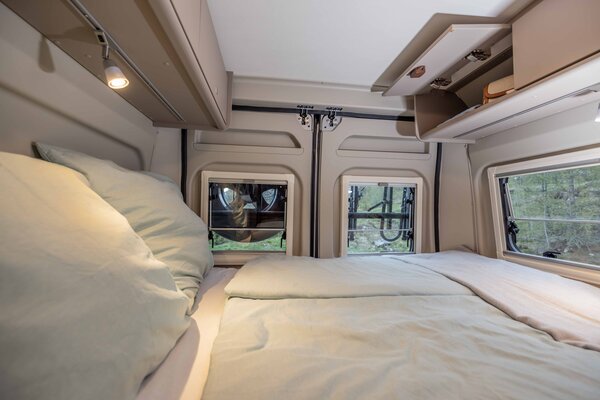 Unsere Längseinzelbetten im Camper Van bieten höchsten Schlafkomfort dank hochwertiger Matratzen und einem stabilen Holzlattenrost. Mit einer Länge von bis zu 1,92 m sind diese Betten ideal für größere Personen. Der schmale Aufbau und die breite Liegefläche nutzen den Raum optimal aus, sodass der Wohnbereich geräumig und komfortabel bleibt. Jedes Detail ist durchdacht, um Ihnen ein mobiles Zuhause zu bieten, das sowohl praktisch als auch gemütlich ist.
