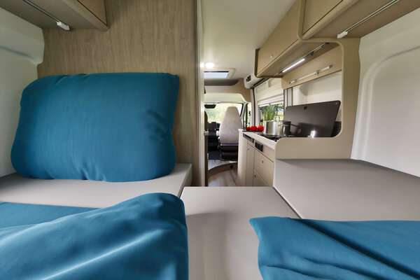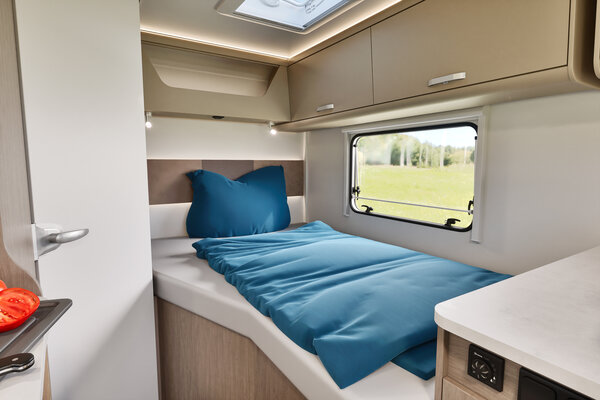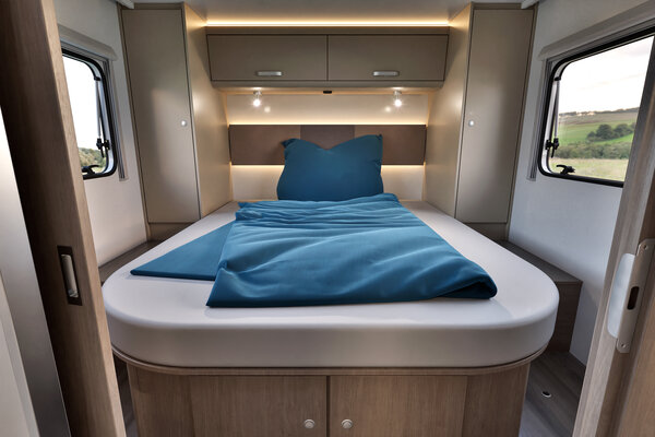 Durch das kompakte Heckquerbett nutzen Sie die volle Breite des Reisemobils optimal aus wodurch ein tolles Raumgefühl entsteht. Ausgestattet mit hochwertigen Matratzen finden Sie einen angenehmen Rückzugsort im Heck. Erholen Sie sich auf einer Liegefläche von bis zu 2,10 m x 1,5 m und verstauen Sie ganz einfach und bequem Ihr Gepäck in den praktischen Dachstauschränken über dem Bett.