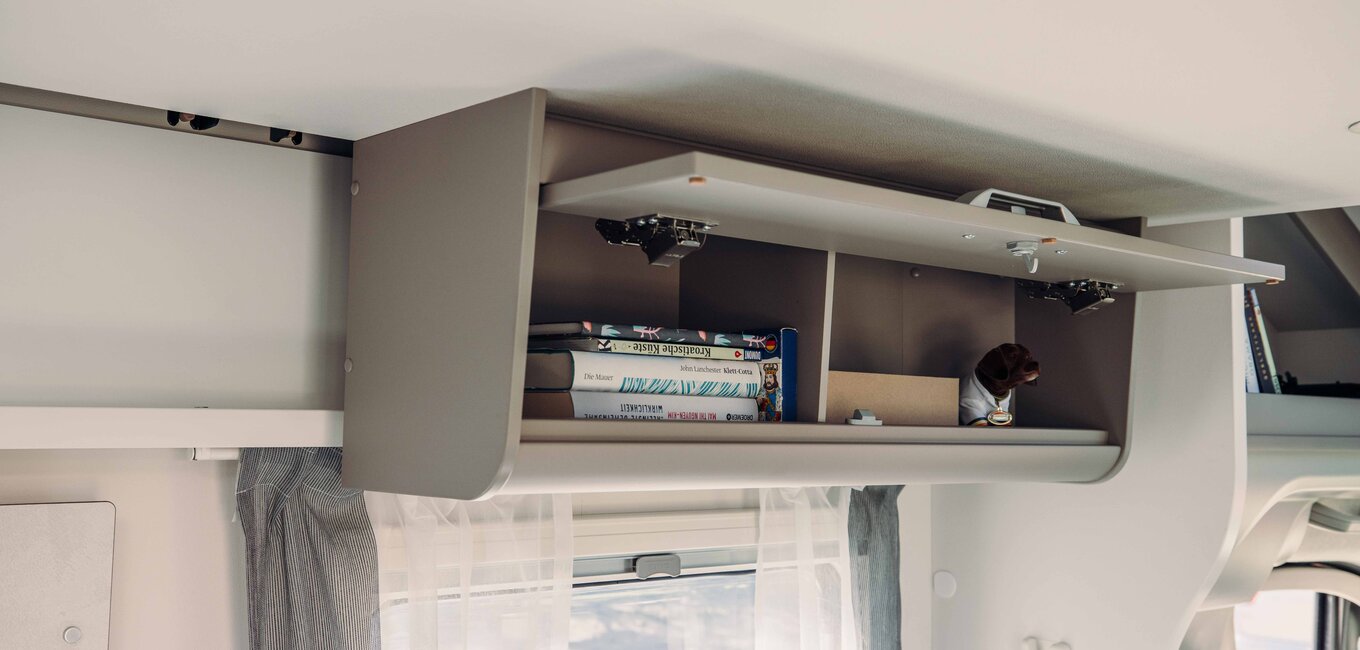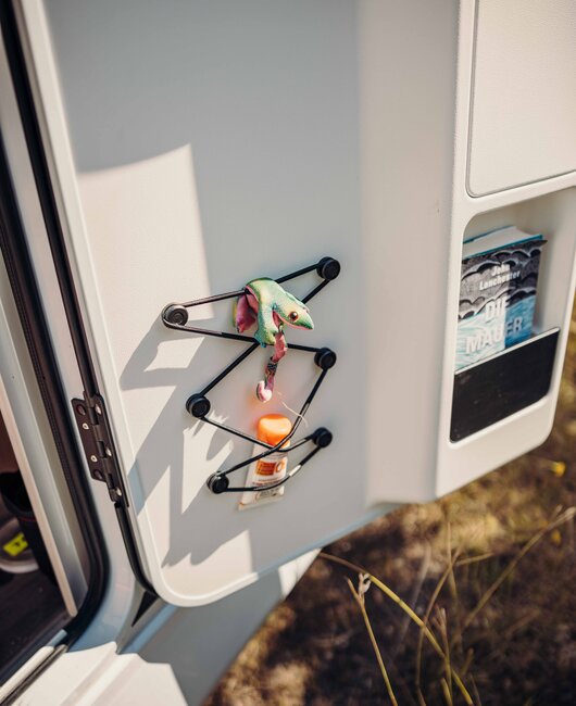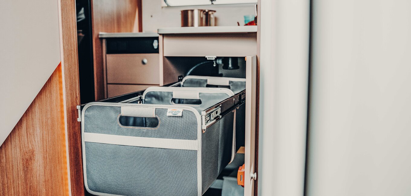 Nos camping-cars Carado sont dotés de nombreuses solutions de rangement bien pensées. Les objets encombrants comme les chaises de camping ou les vélos peuvent être stockés dans le coffre arrière. Pour plus de sécurité, vous pouvez les fixer avec des bandes élastiques ou des sangles d'arrimage. Les œillets d'arrimage vous facilitent la tâche. Et grâce aux pratiques tapis antidérapants, chaque chose reste bien à sa place. Si vous transportez vos bicyclettes sur un porte-vélo, n'hésitez pas à renforcer votre installation avec un cadenas sur les sangles d'arrimage. Cela vous protège des vols, mais aussi des pertes.