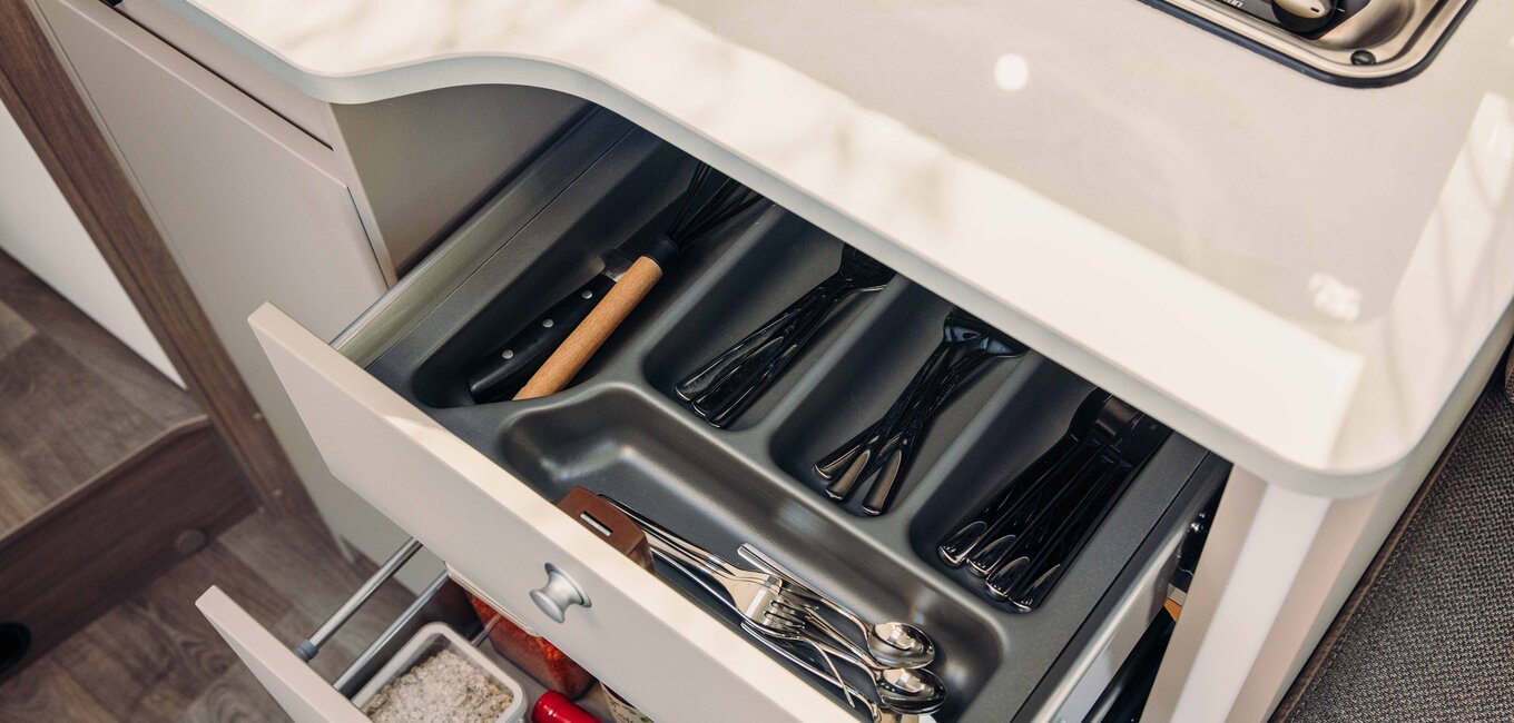 les boissons et boîtes de conserve vont dans les placards du bas ou dans les tiroirs sous les sièges. Si votre camping-car dispose de compartiments au sol, vous pouvez également les utiliser. Évitez également de ranger poêles et casseroles en hauteur. Les choses légères comme les vêtements ou les verres peuvent être mis dans les placards. Autre conseil très important concernant le niveau du réservoir d'eau : lorsque vous conduisez, nous vous recommandons de ne le remplir que jusqu'au tiers. Cela permettra d'alléger le poids total du véhicule, mais aussi de dépenser moins d'essence.
