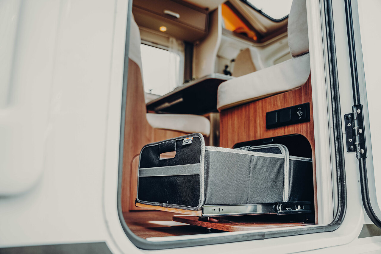 Vous avez sans doute déjà entendu Radio Autoroute vous mettre en garde contre la perte de vélos. À l'intérieur aussi, mieux vaut s'assurer que rien ne traîne. Pour éviter tout incident, assurez-vous de bien tout ranger dans les placards intégrés. Vous pouvez pour cela vous inspirer du système de rangement Meori. Il vous permet de bien tout ranger et de garder un œil sur vos affaires. Vous pouvez remplir les boîtes Meori chez vous et ensuite les ranger dans les placards de votre camping-car. Et n'oubliez pas : ne rangez jamais d'objets lourds dans des placards suspendus qui s'ouvrent dans le sens de la marche. Ils pourraient se transformer en dangereux projectiles en cas de freinage. Vous avez bien tout noté ? Alors vous pouvez partir l'esprit détendu. Une dernière chose : chez Carado, nous avons développé quelques solutions pour vos objets de valeur. Vous pouvez par exemple installer un coffre-fort de sol ou dans la porte passager de votre camping-car. Parfait pour ranger espèces, cartes de crédit et papiers d'identité en toute sécurité.