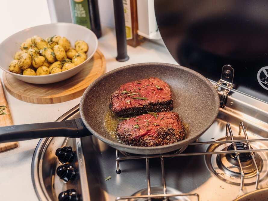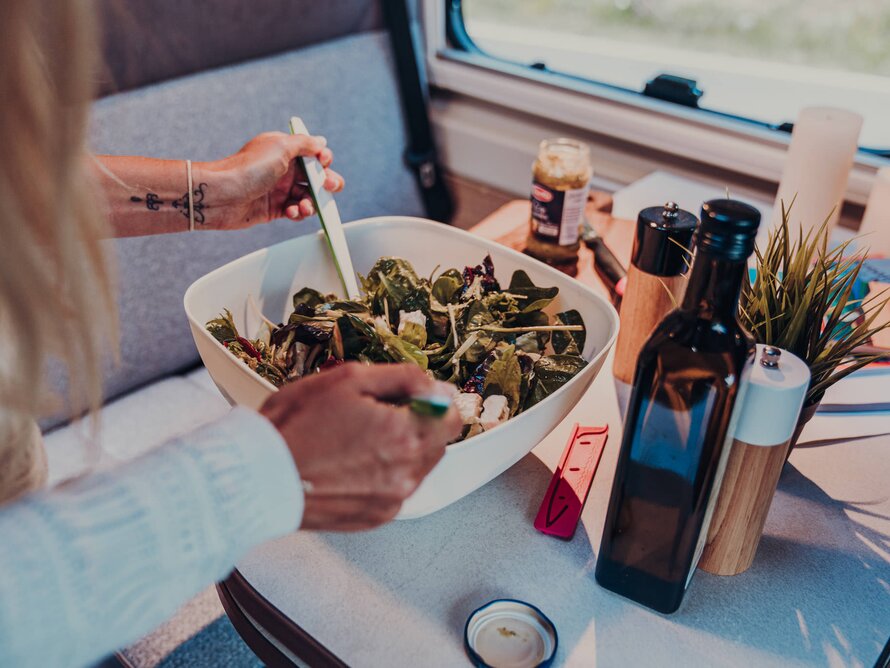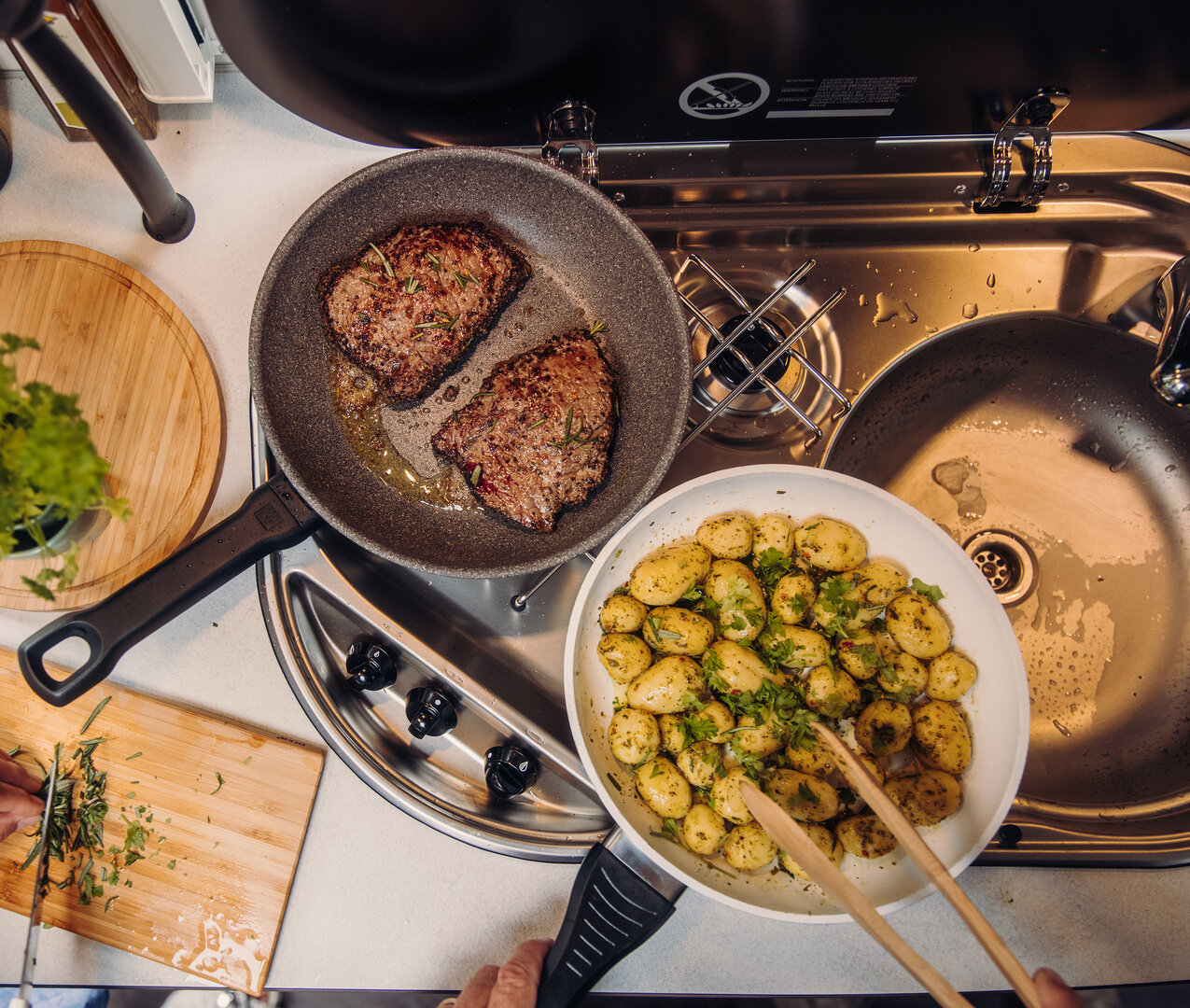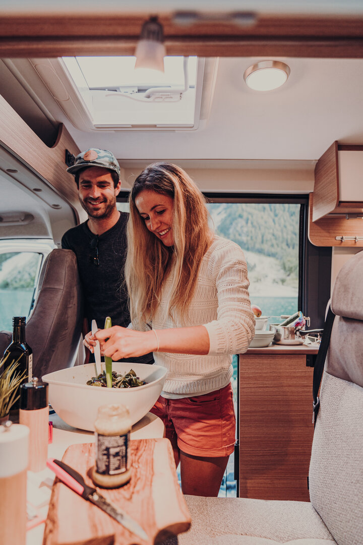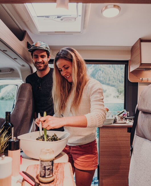 L'époque où les vacances en camping étaient synonymes de cuisine simple est révolue depuis bien longtemps. Au lieu des raviolis en boîte et autres plats préparés, l'accent est désormais mis sur une alimentation saine et variée, tout à fait possible dans un véhicule de loisirs. La dînette astucieuse de votre Carado offre les conditions idéales pour cuisiner facilement de délicieux produits frais même lorsque vous êtes sur la route. Afin de vous inspirer pour votre prochain voyage avec des plats peu coûteux et rapides, mais toujours savoureux, nous avons interrogé notre communauté sur les plats les plus populaires sur la route.