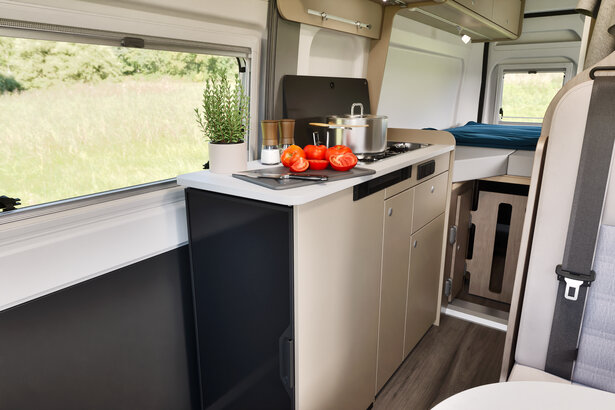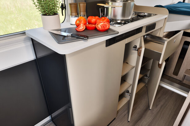 La cuisine astucieuse et bien équipée du CV640 est idéale pour les adeptes de voyage qui ne veulent pas renoncer aux joies de la cuisine où qu'ils se trouvent. Avec une plaque de cuisson deux feux avec couvercle en verre, elle permet de préparer facilement de délicieux repas. D'ailleurs, son couvercle en verre ne fait pas seulement office de protection anti-éclaboussures, mais aussi de surface de travail supplémentaire.