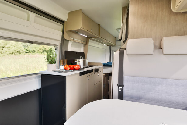 Les sièges pivotants du conducteur et du passager transforment rapidement la dînette du camper van en un vrai espace de vie convivial et spacieux tout en contribuant à un plus grand confort à bord.