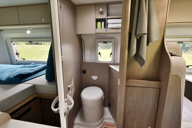 La salle d'eau compacte du CV640 est équipée de toilettes et d'un lavabo, ce qui est très pratique. En effet, le compartiment peut également être transformé en douche, il suffit d'y installer le pommeau de douche et d'ouvrir l'eau. Cette polyvalence permet aux voyageurs de se rafraîchir sur la route et de profiter du confort de leur propre salle d'eau.