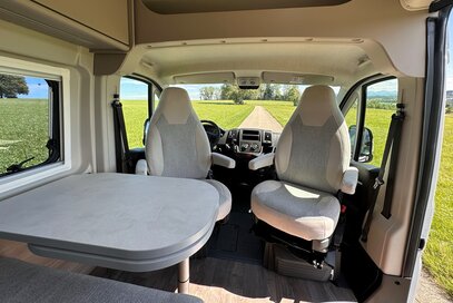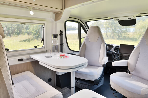 Grâce aux sièges conducteur et passager pivotants, la dînette se transforme en un espace de vie confortable qui peut être utilisé de manière flexible, pour y manger ou y travailler. Il suffit de tourner les sièges dans la position souhaitée et de déplier la table pour créer un agréable coin repas.