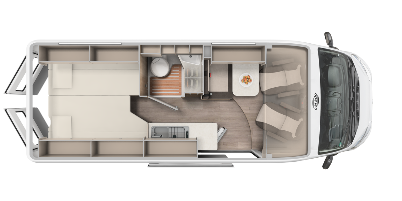 Ce camper van Carado se veut spacieux et agréable à vivre. Les meubles sont disposés de manière à optimiser l'espace tout en offrant suffisamment de place pour y ranger des vêtements, des aliments ainsi que d'autres effets personnels. Grâce à un agencement bien pensé, on s'y déplace en toute liberté et on s'y sent rapidement à l'aise.