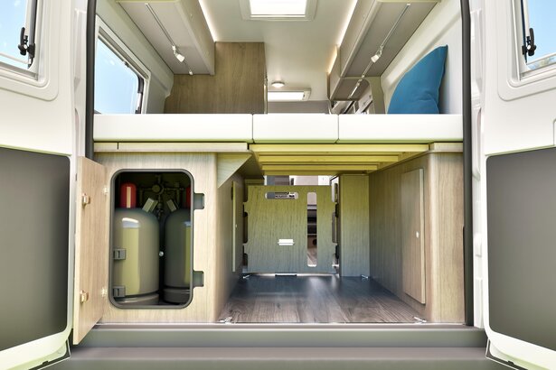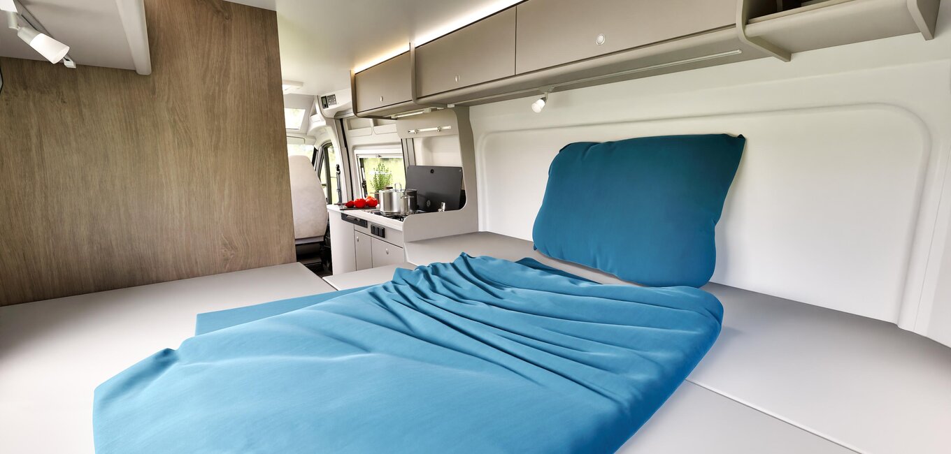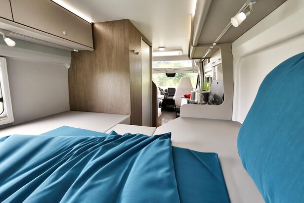 Oasis de sommeil avec vue panoramique. Avec le lit longitudinal à l'arrière, il suffit pour cela d'ouvrir les portes.
