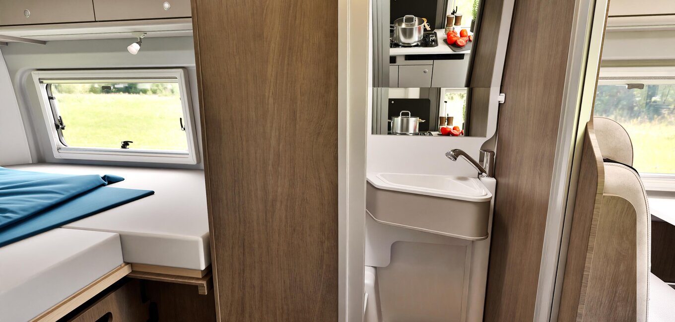 Avec sa salle de bain pivotante astucieuse, le Camper Van pro+ offre une solution pratique pour plus de confort sur la route. La conception pivotante crée un espace douche séparé en un clin d'œil. Vous bénéficiez ainsi d'une flexibilité maximale sans sacrifier le confort : votre maison mobile loin de chez vous.