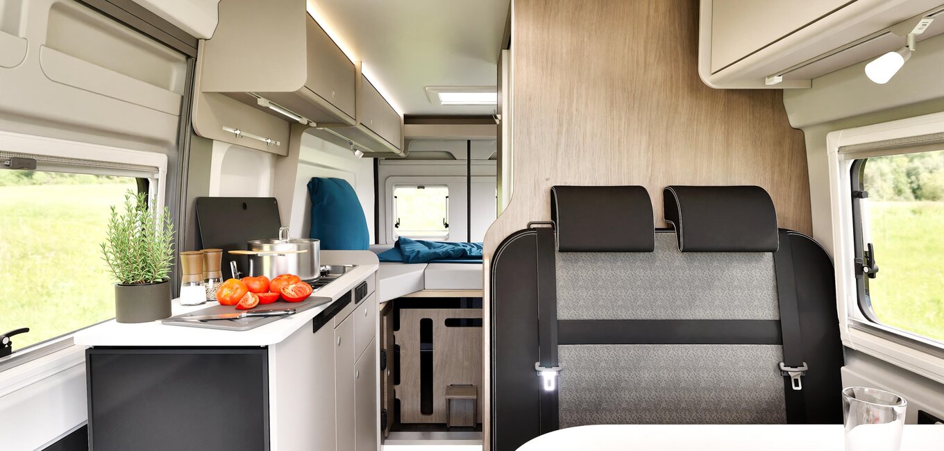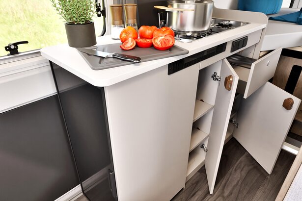 Le CV640 Pro+ prouve que l’on peut cuisiner aisément même dans un véhicule compact. Une plaque de cuisson à 2 feux, un aménagement efficace et un plan de travail généreux – tout est pensé pour des expériences culinaires uniques.