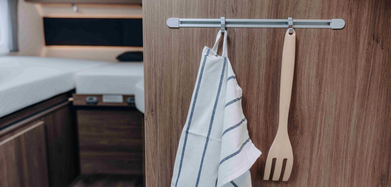 Un porte essuie-tout dans le camping-car résout un problème récurrent : au lieu de devoir ranger le rouleau avant chaque trajet, ce dernier reste bien en place et facilement accessible.