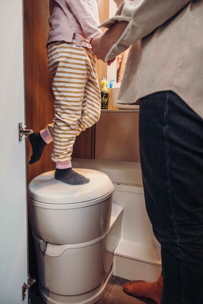 Thanks to the practical dividing door to the living area, the comfort bathroom is not only designed as a bathroom, but also serves as a dressing room. Thanks to the generous layout of the toilet and shower area as well as numerous storage options, the bathroom offers a spacious and functional environment.