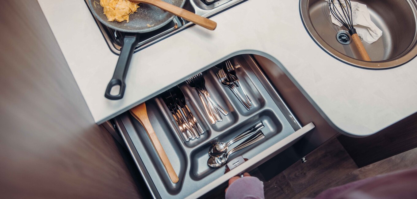 Thanks to the compact design, practically arranged cupboards with space-saving partitions and drawers with Servo-Soft, the L-shaped kitchen leaves nothing to be desired. There is also space for several days' worth of provisions in the fridge.