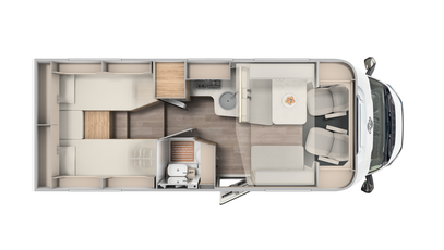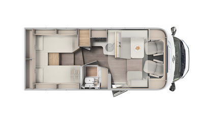 Bodelsdøren er udstyret med et ergonomisk håndtag på både inder- og ydersiden. Sammen med det elektriske trin er det mere behageligt og sikkert at komme ind og ud. Praktiske hylder og en surringsstrop holder også din bagage på plads på en smart måde.