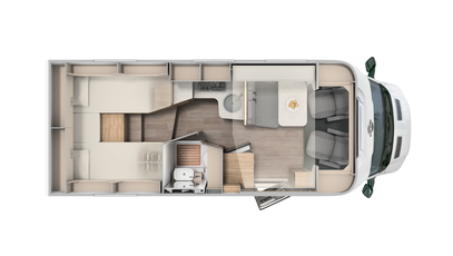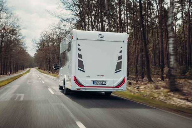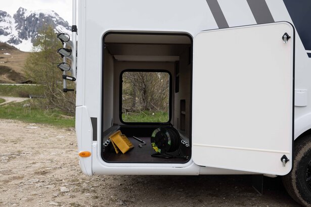 Klar til ferien: Påbygningen på den delintegrerede autocamper er lavet af robust GFK (glasfiberarmeret plast) - sidevæggene er af aluminium. Og alt dette med en 7-års tæthedssikring. I de rummelige opbevaringsrum og den enorme garage i bagenden kan større ting opbevares sikkert.
