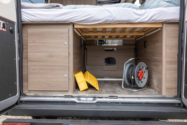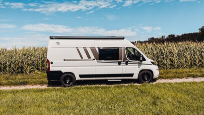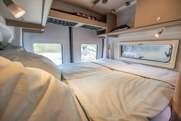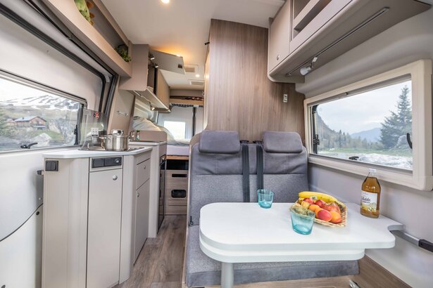 The camper van impresses with its panoramic window in the driver's cab and the lengthways bed in the rear. Simply open the doors and enjoy the view.