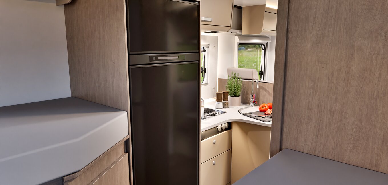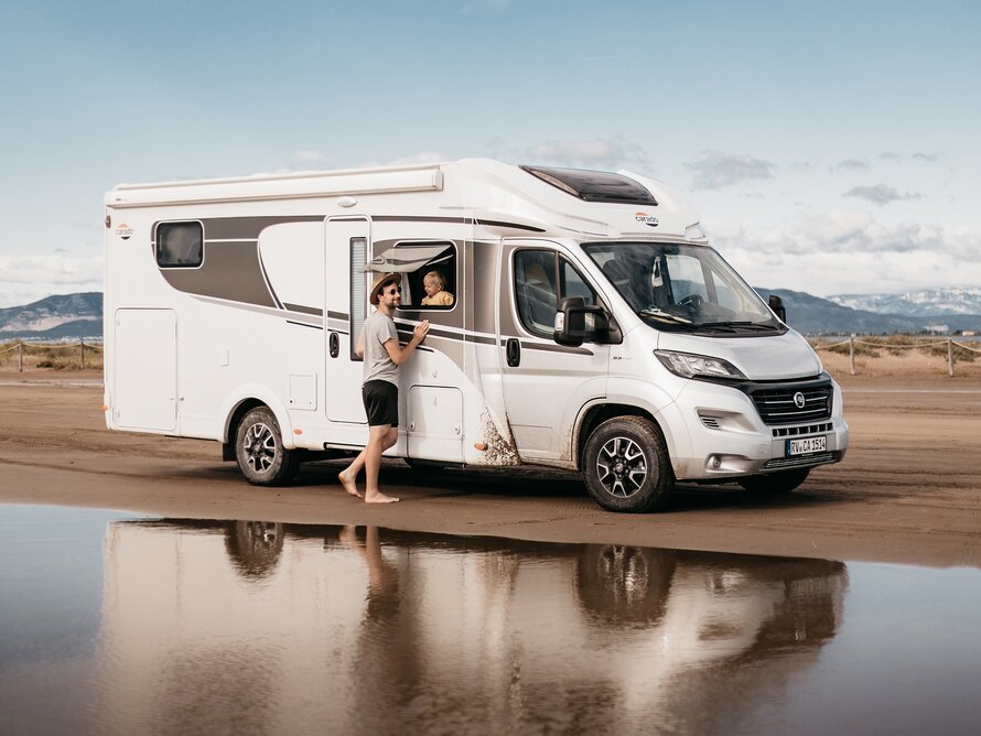 The Carado T448 impresses with its length of 7.29 metres. The semi-integrated vehicle also has an ergonomically shaped handle on the entrance door for easy access. Despite its handy design, it is easy to manoeuvre and offers enough space for all the things you need during your holiday.