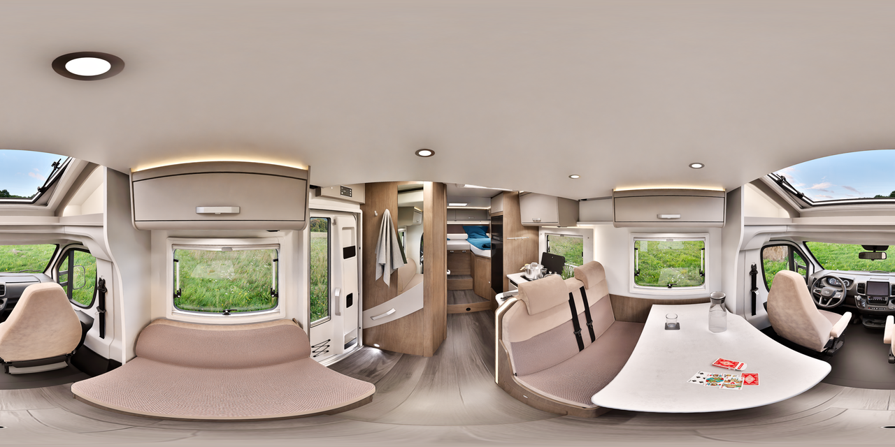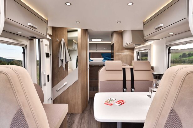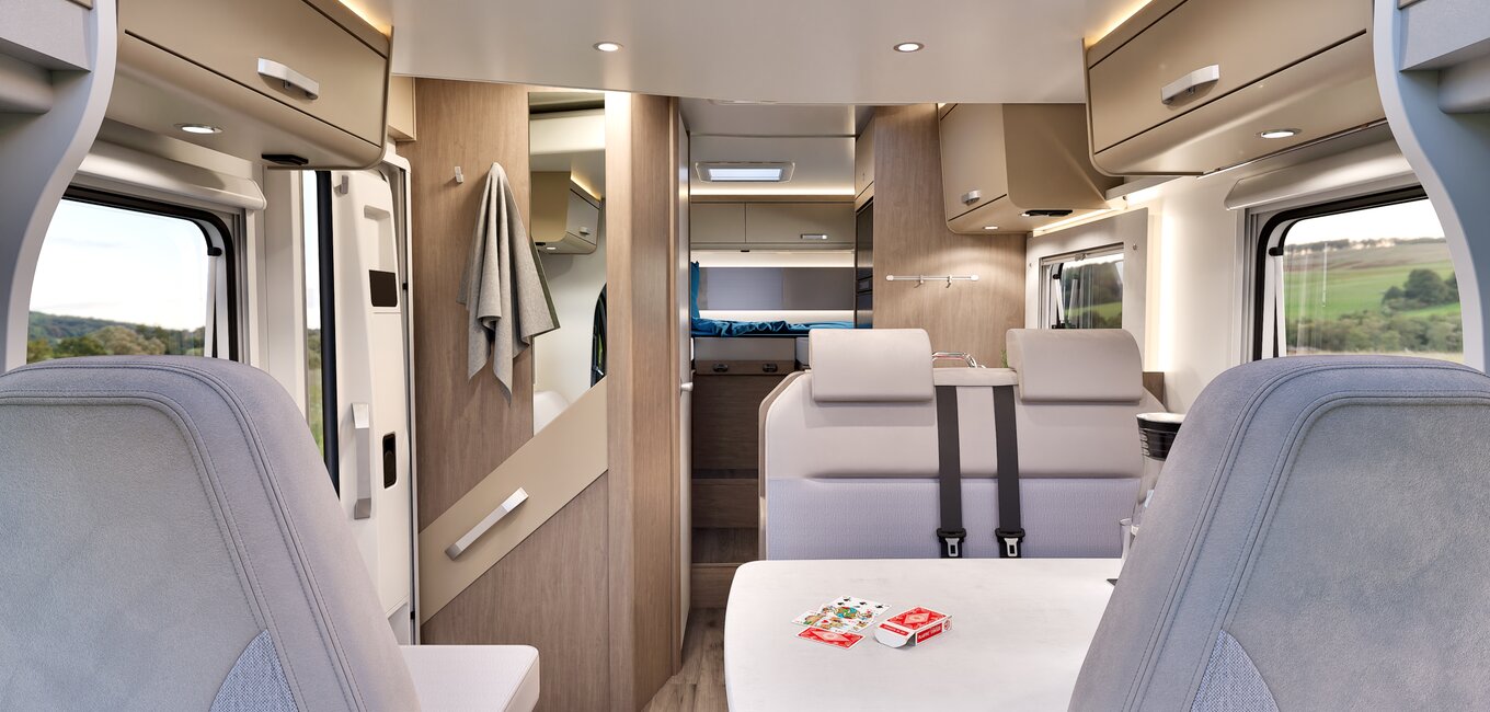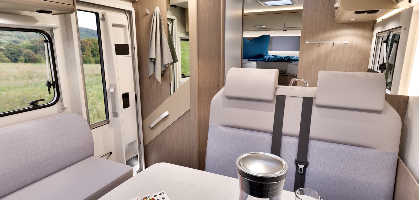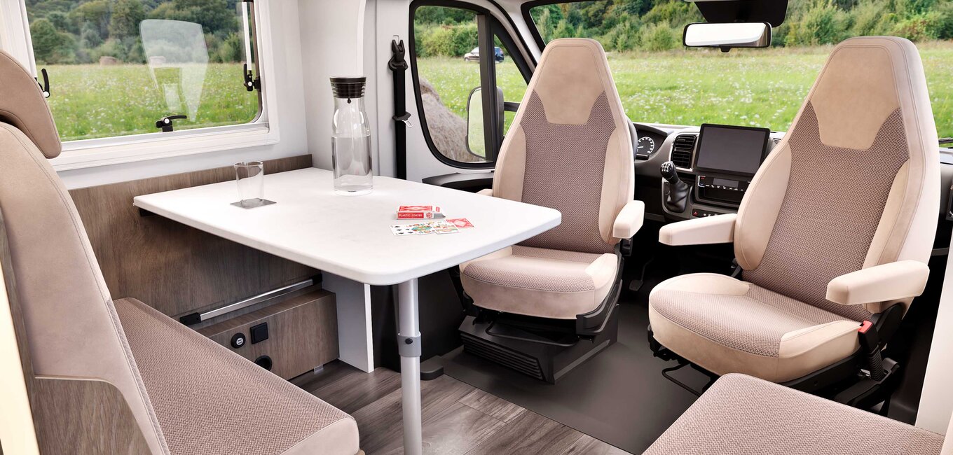 The swivelling driver and passenger seats create a flexible seating area around a functional table. This spacious seating area not only allows for socialising, but also practical comfort by creating a versatile space for entertainment and relaxation.