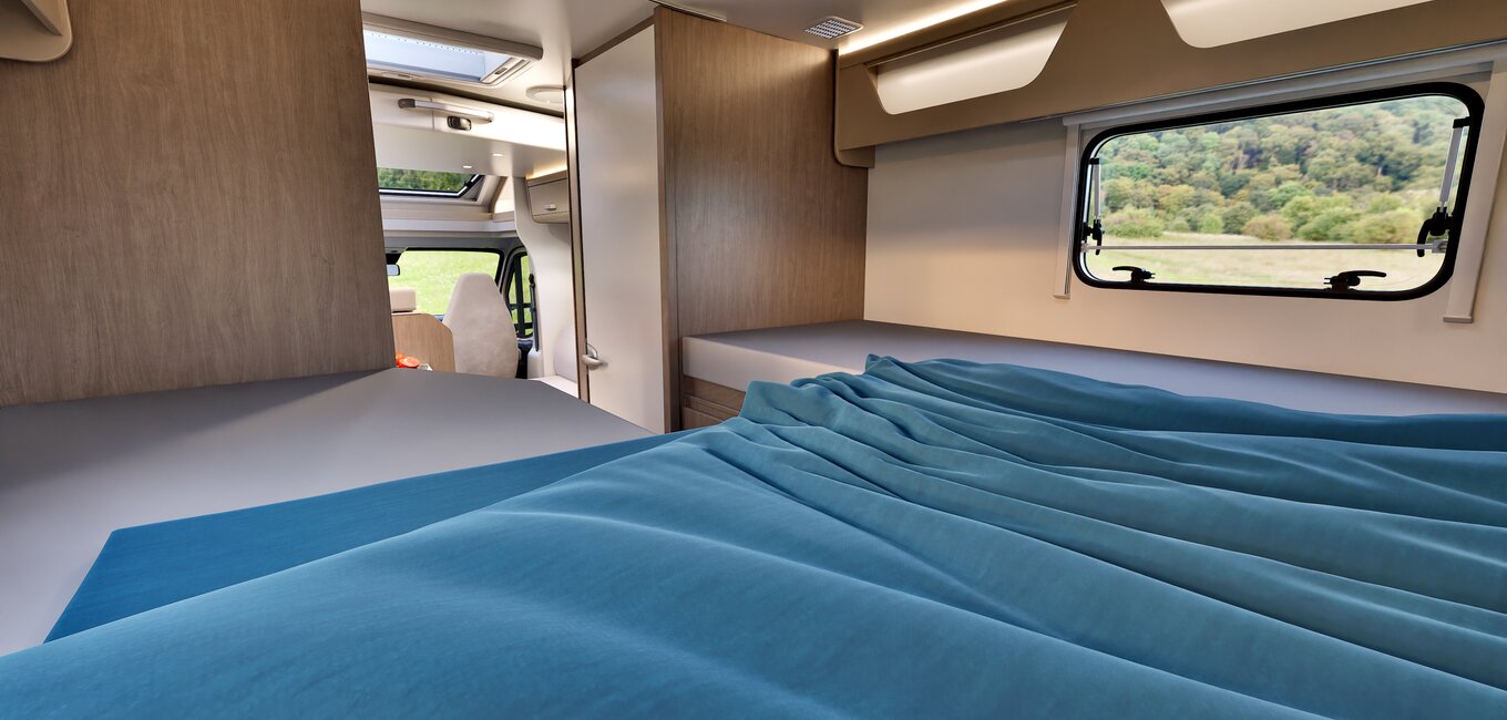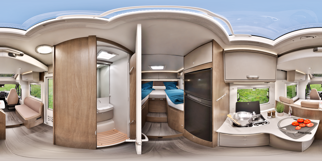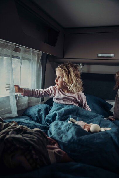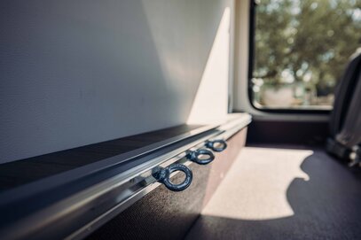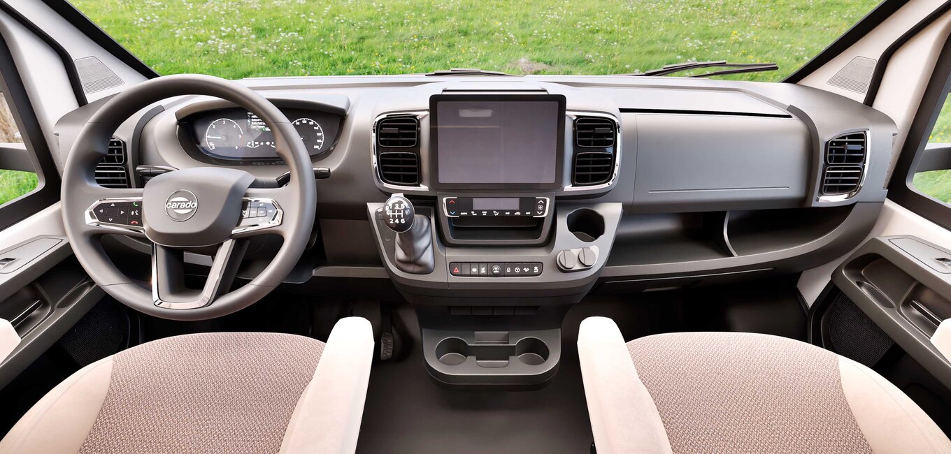 The swivelling driver and passenger seats create a flexible seating area around a functional table. This spacious seating area not only allows for socialising, but also practical comfort by creating a versatile space for entertainment and relaxation.