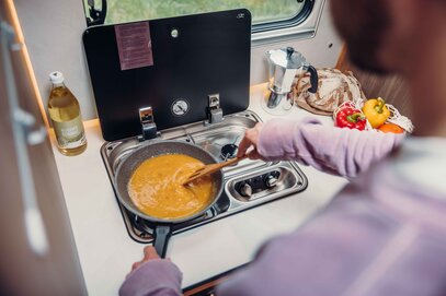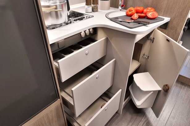 The Variobath combines everything you need in the bathroom in the smallest of spaces. Enjoy comfort and functionality while travelling. You will also find numerous storage compartments.