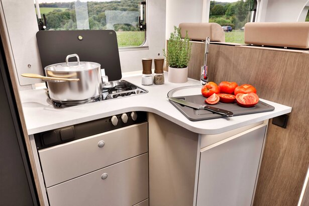 The L-shaped kitchen puts everything at your fingertips. A simple arm's length away, the 2-burner hob provides a safe cooking environment, while the well thought-out arrangement of the kitchen units ensures an uncomplicated cooking experience.