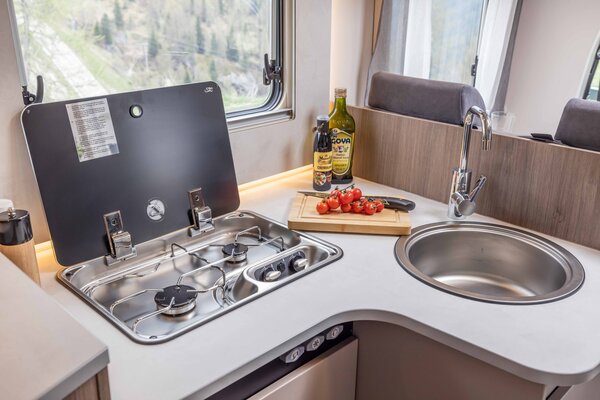 Simply perfect: With the practical combination of hob and sink, the space in our side kitchens can be used optimally. The drawers with Servo-Soft provide additional ease of use. With the high-quality 2-burner hob with piezo ignition and split glass cover, safe cooking comes as standard. Our LED lighting provides a pleasant lighting concept that simply invites you to cook together.