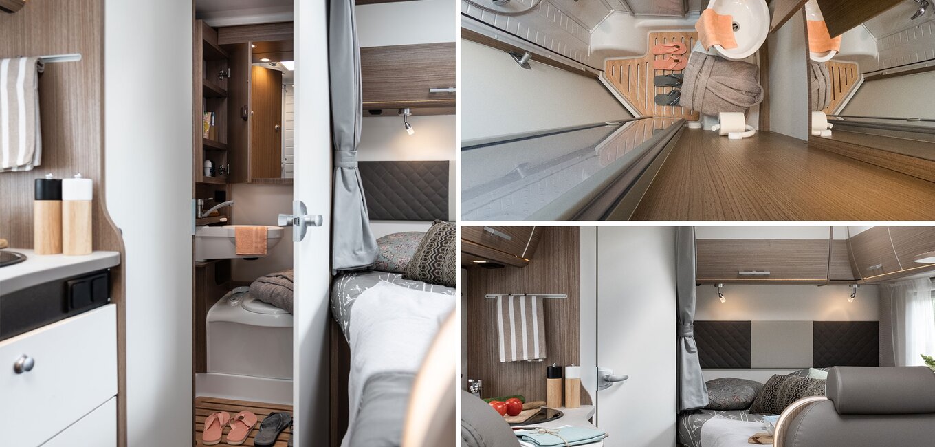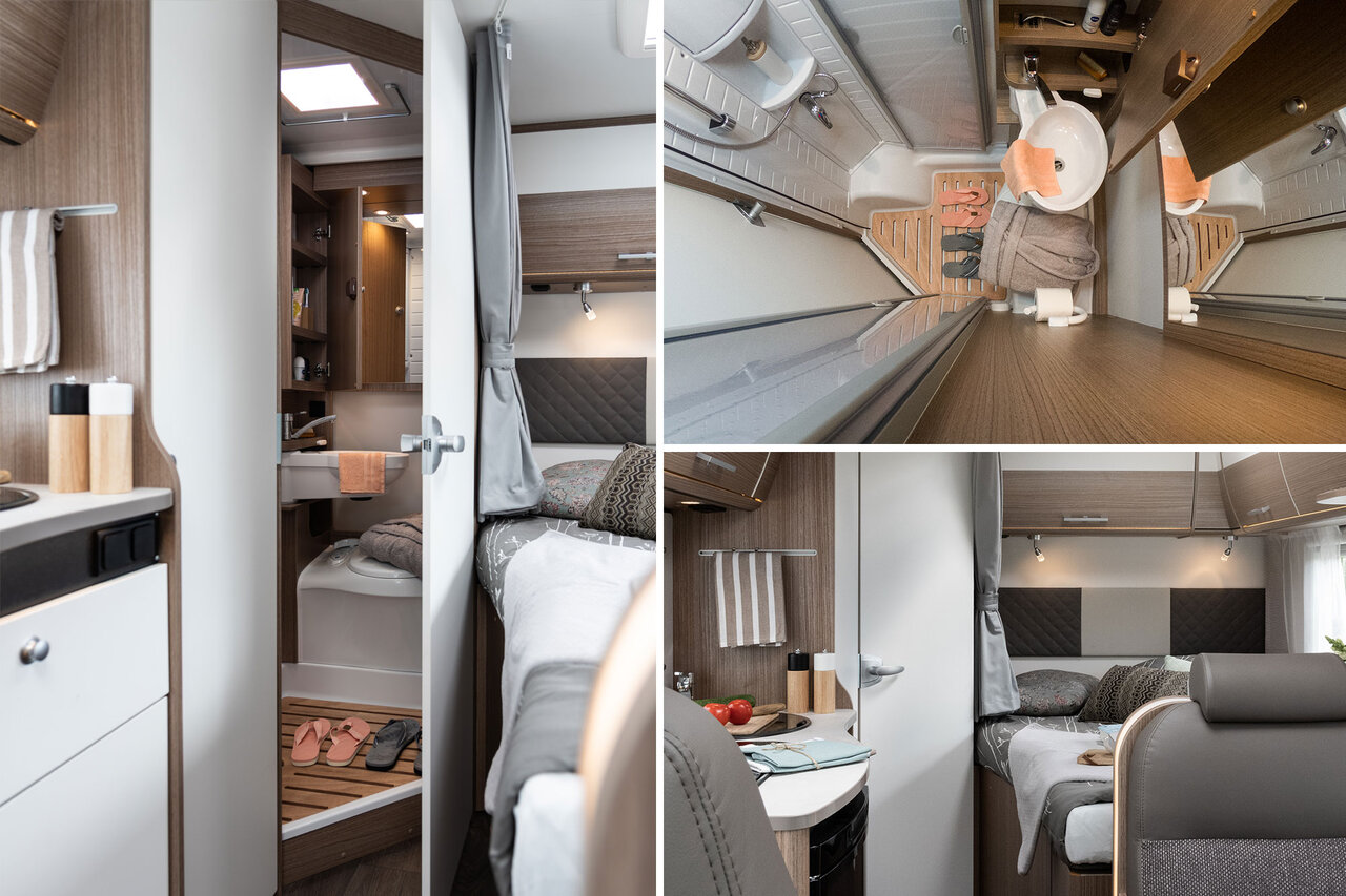 Badene i de halvintegrerte modellene er sofistikerte og fylt med praktiske detaljer. Innfelte LED-spotter skaper en avslappende atmosfære. I tillegg har den separate dusjen alt klart til bruk – bare hopp inn for en rask oppfriskning, så er du klar for neste eventyr eller en rolig kveld med avslapning.