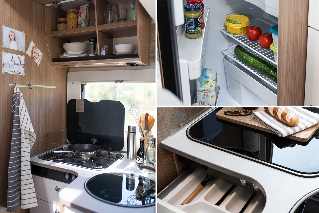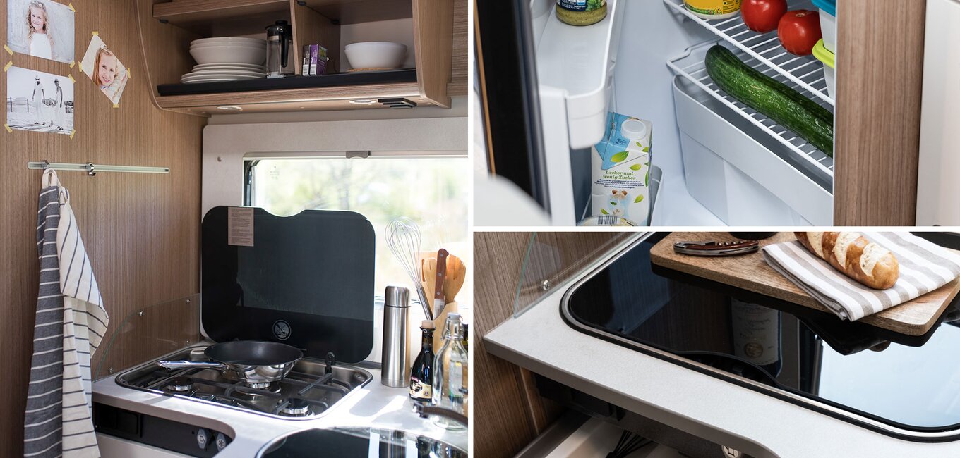 Et kjøleskap med fryser, en trebluss-komfyr og smarte oppbevaringsløsninger gjør det ergonomisk utformede kjøkkenet i de halvintegrerte modellene perfekt for matlaging på veien. Det finnes også mange tilvalg for å skreddersy utstyret, slik at matlagingen blir en lek.
