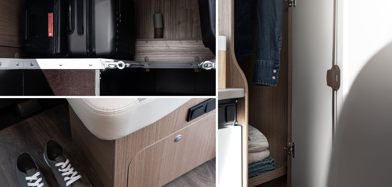 Når det er så mye å huske på, er det godt å vite at én ting er under kontroll: oppbevaring. Våre bobiler har plass til det meste. Den romslige garasjen rommer enkelt sykler, bagasje og annet stort utstyr. Og småting? De finner raskt sin plass i de smarte hyllene og oppbevaringsrommene inne i bodelen.
