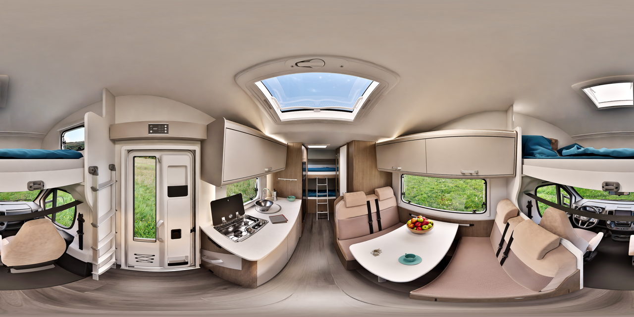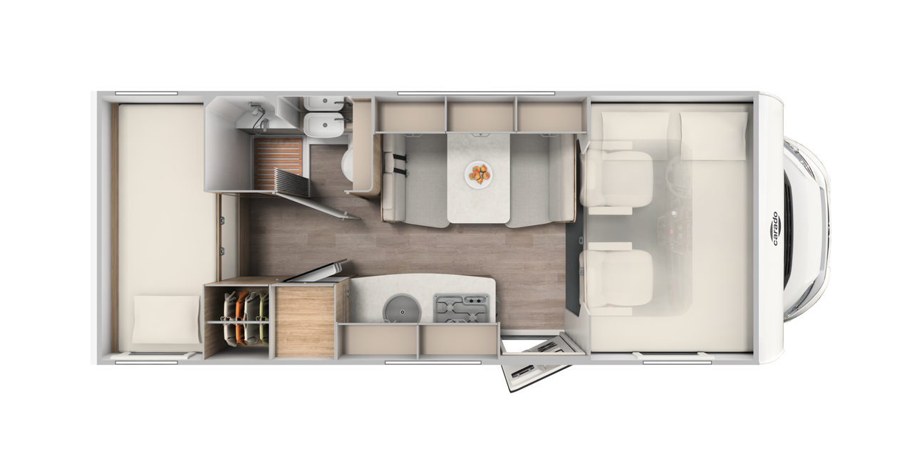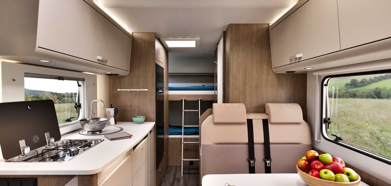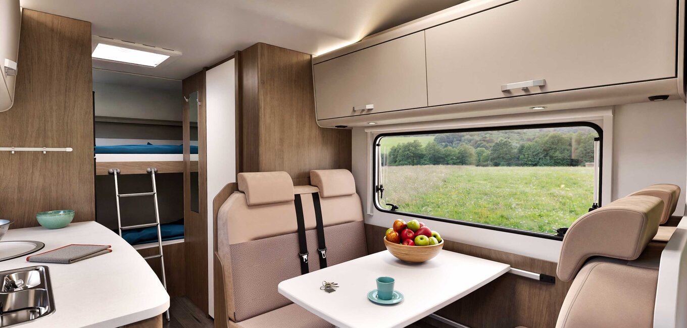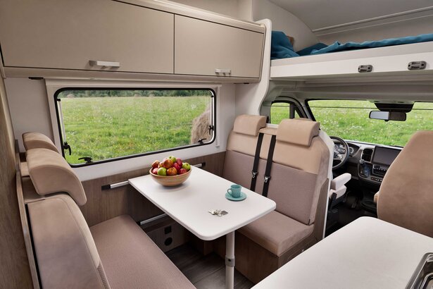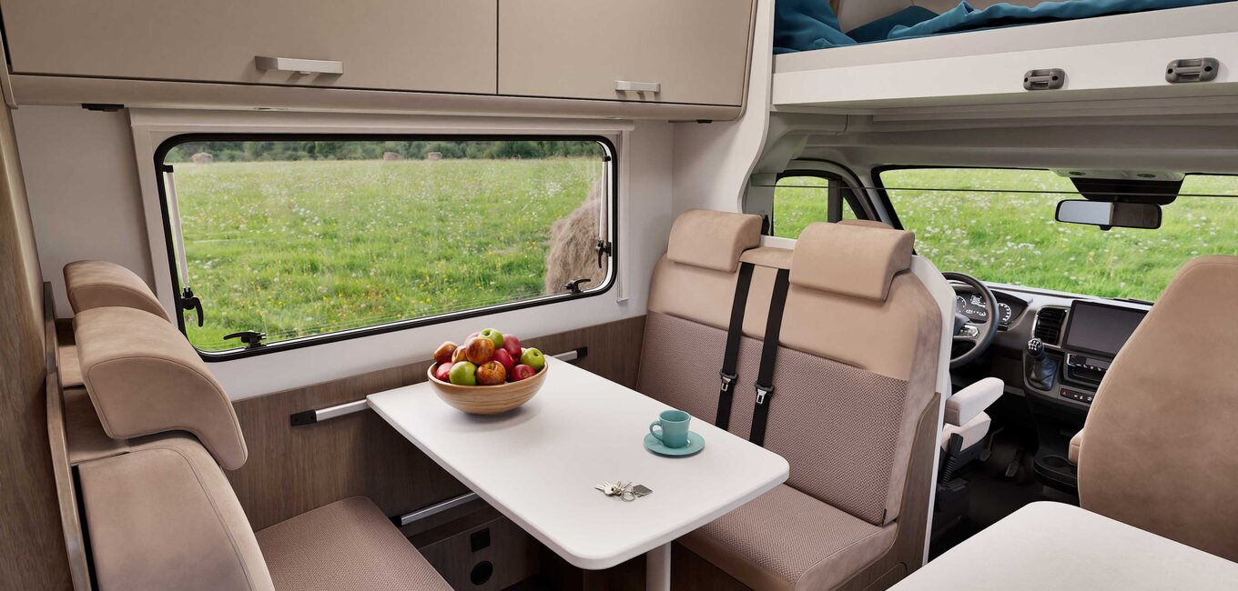 Oppholdsrommet i A361-bobilen skaper en åpen og innbydende atmosfære og er utstyrt med en romslig face-to-face sittegruppe som inviterer til å bli værende – ideelt for sosiale stunder og avslappende kvelder i bobilen.