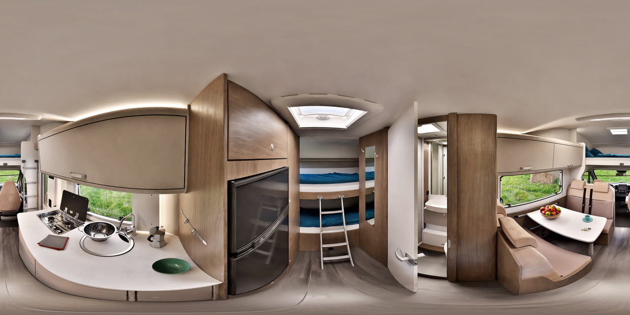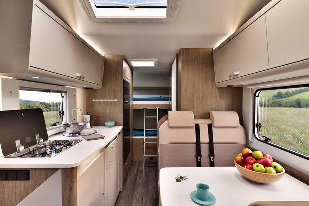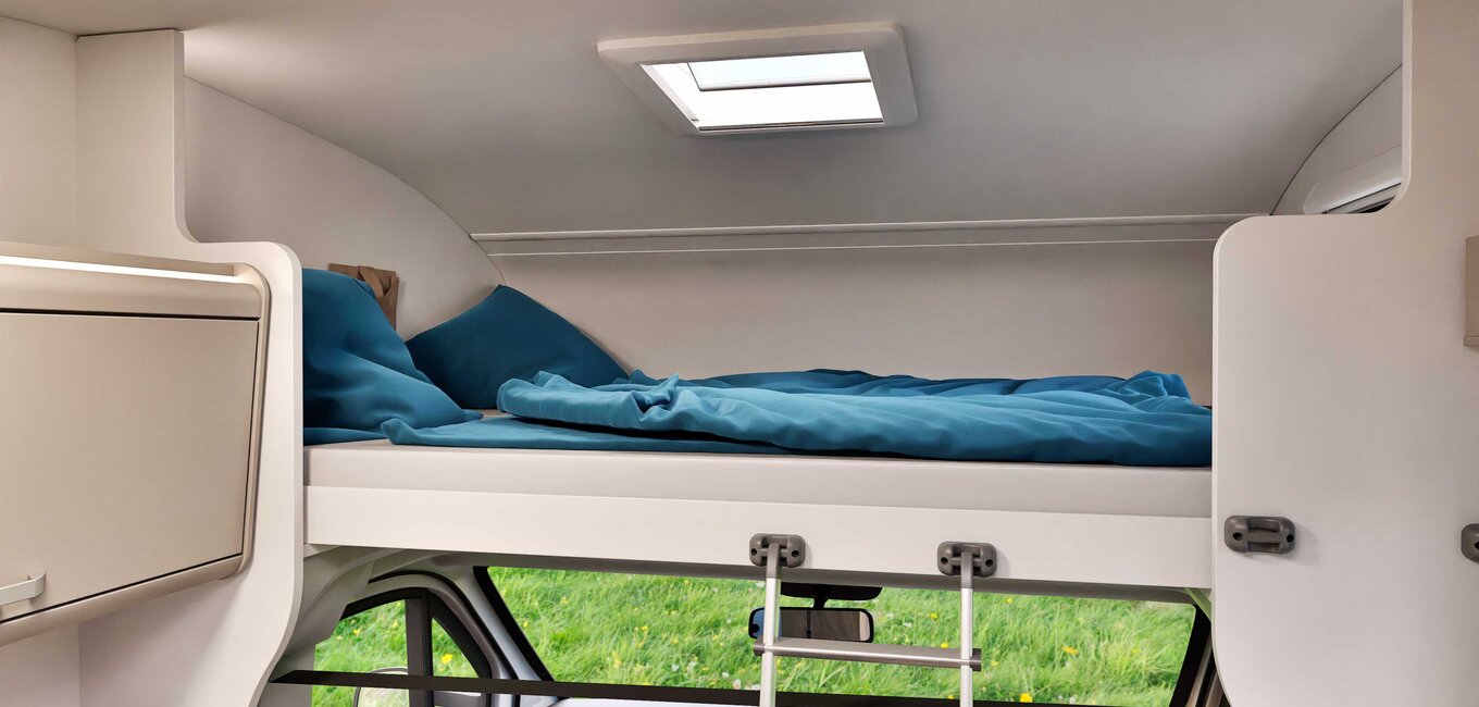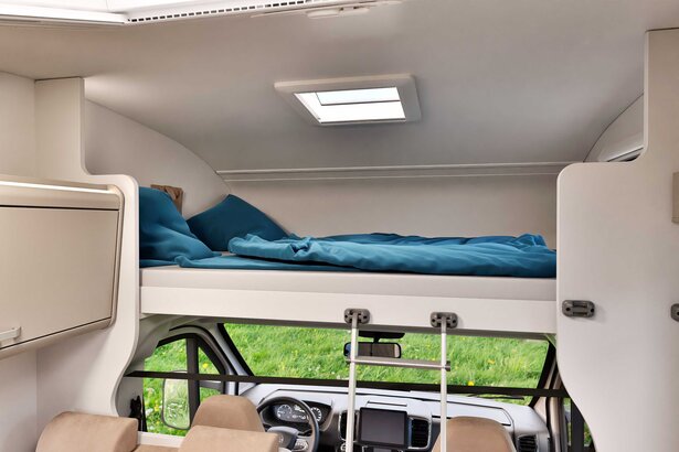 De smart integrerte køyesengene bak og den sammenleggbare alkovesengen i Carado A361 er utstyrt med høykvalitets madrasser og tilbyr utmerket sovekomfort. Takket være alkoven gir A361 koselige soveplasser uten å begrense oppholdsrommet. I tillegg kan sittegruppen enkelt gjøres om til en seng – perfekt for familier og grupper.