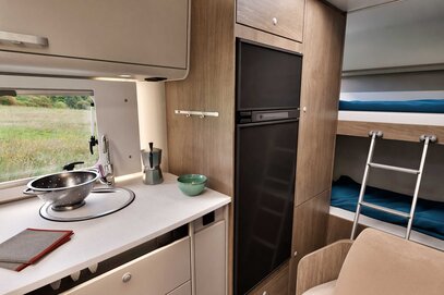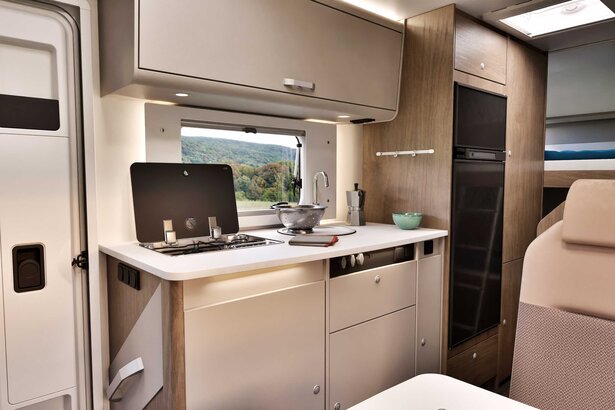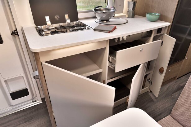 Det praktiske sidekjøkkenet i Carado A361 imponerer med en bred benkeplate og en effektiv 2-platers komfyr, noe som gjør matlaging til en glede – perfekt for kulinariske opplevelser på veien.