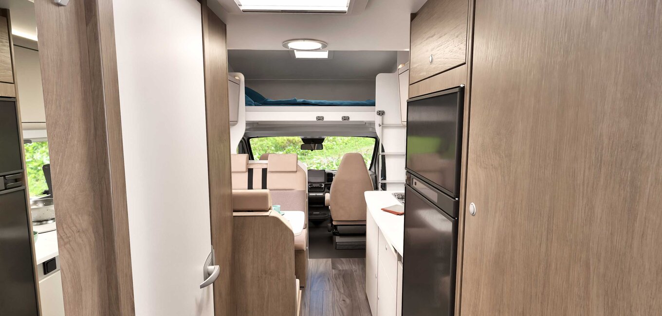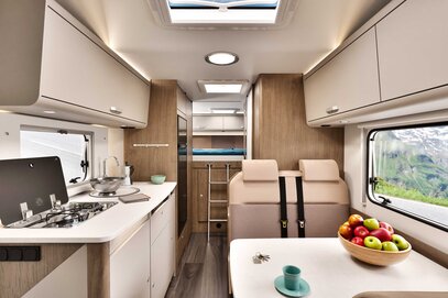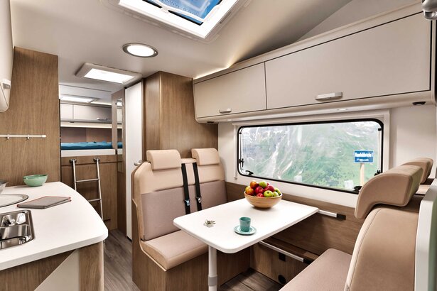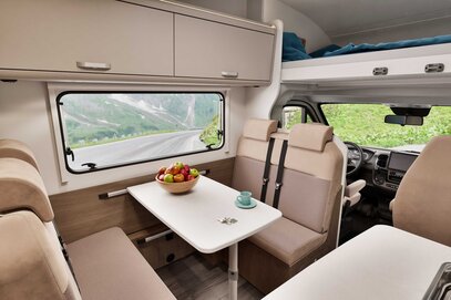 Det komfortable oppholdsrommet er utstyrt med en praktisk face-to-face sittegruppe som lover sosiale stunder i en innbydende atmosfære – ideelt for bobilturer med familien. Høykvalitets materialer og gjennomtenkte detaljer skaper en koselig atmosfære hvor du gjerne tilbringer tid, noe som gjør A464 til en fremragende familievennlig bobil.