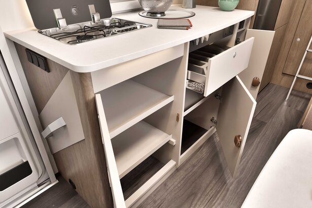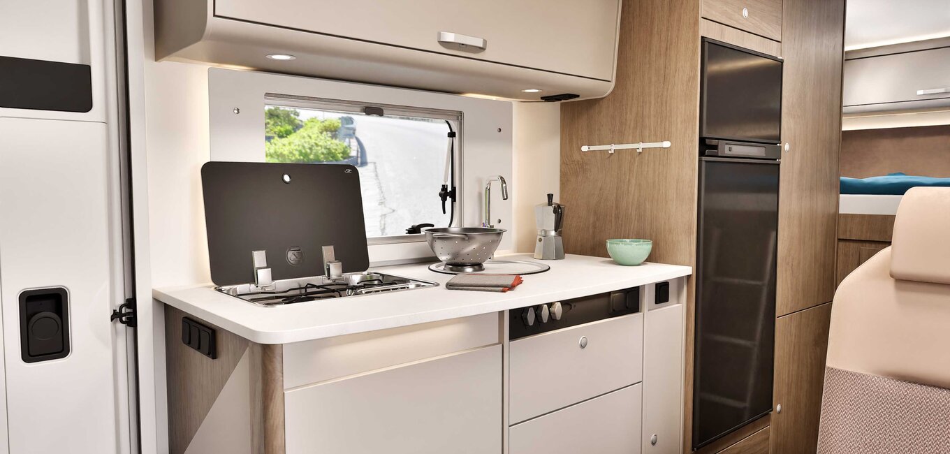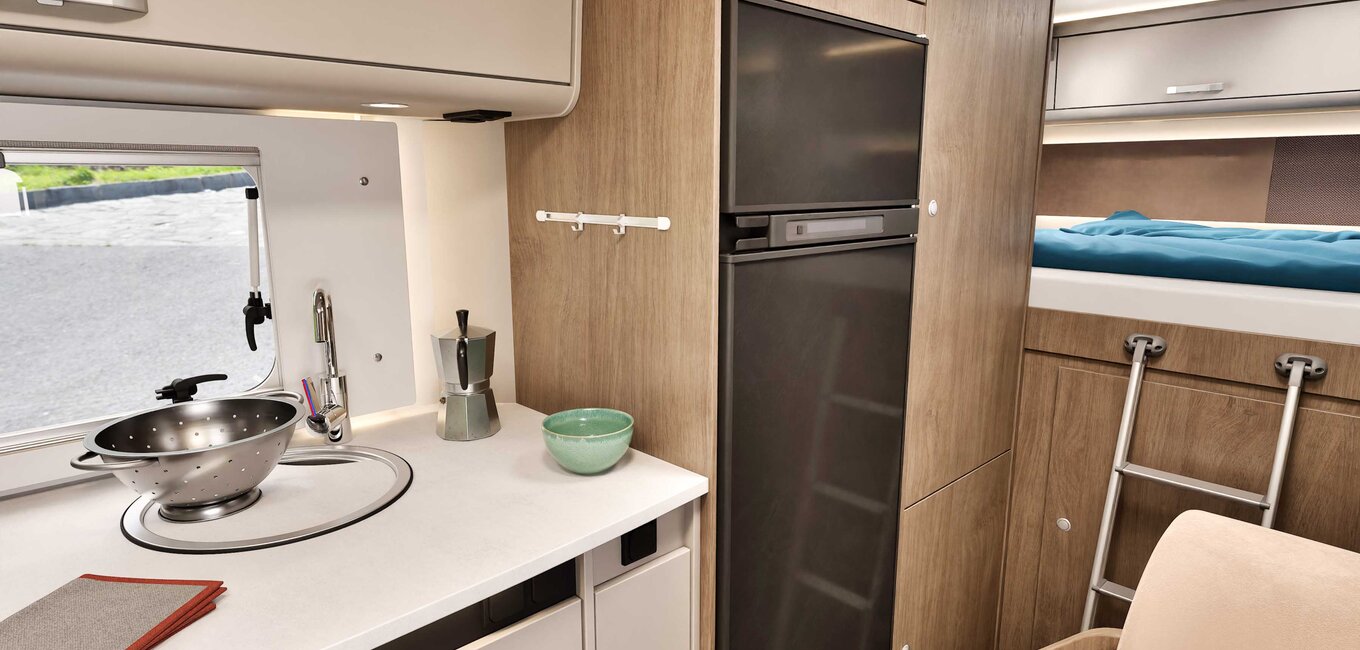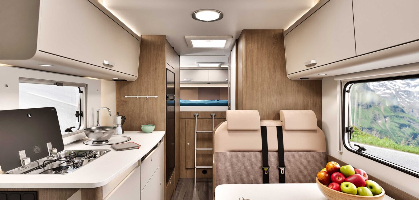 Med sitt innovative lagringskonsept tilpasser alkoven A464 seg fleksibelt til dine behov, perfekt for campingutstyr og reisebagasje. Gjennomtenkte rom og en stor, lett tilgjengelig garasje gir rikelig plass for alt utstyret ditt og nødvendigheter, noe som gjør A464 til en av de beste bobilene for aktive feriegjester.