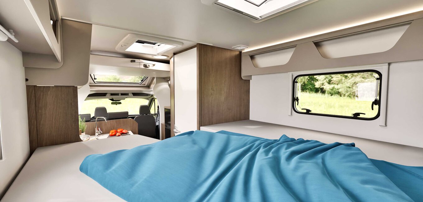 Med sine uttrekkbare enkeltsenger i bakre del tilbyr Carado T338 EDITION26 fleksible sovemuligheter - enkeltvis eller sammenkoblet - for en avslappende nattesøvn på reise.